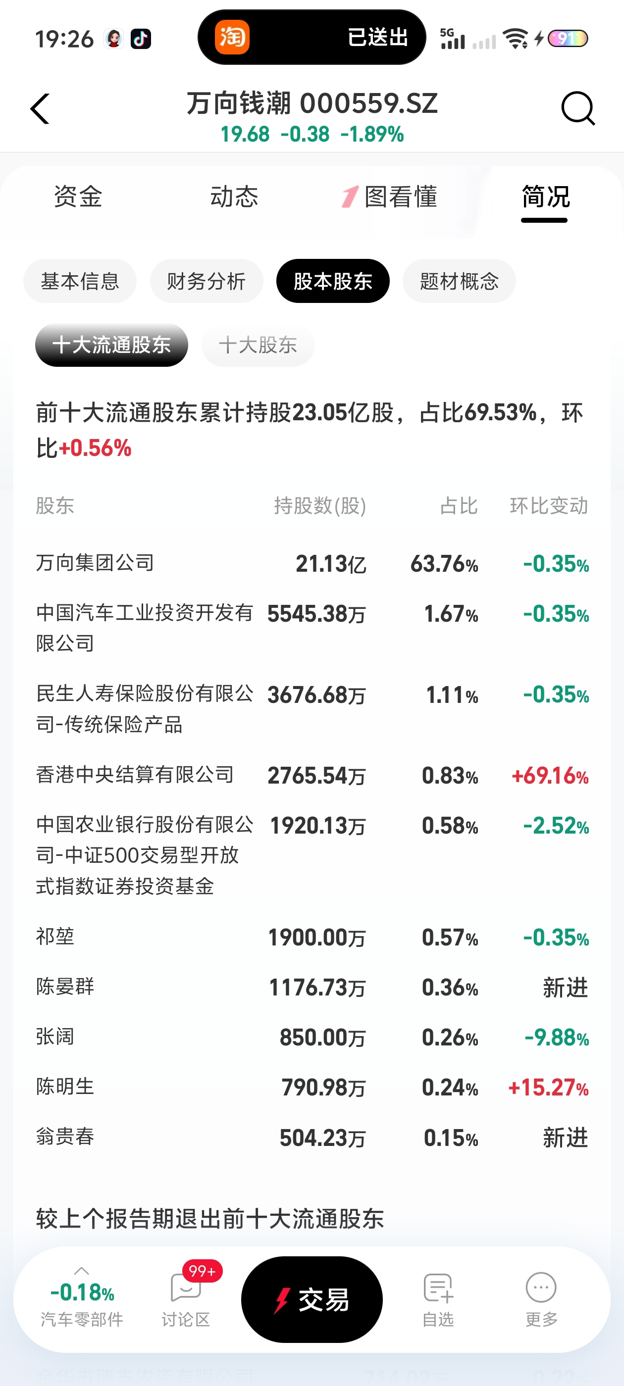 $万向钱潮(SZ000559)$ 陈小群 成10大流通股东了