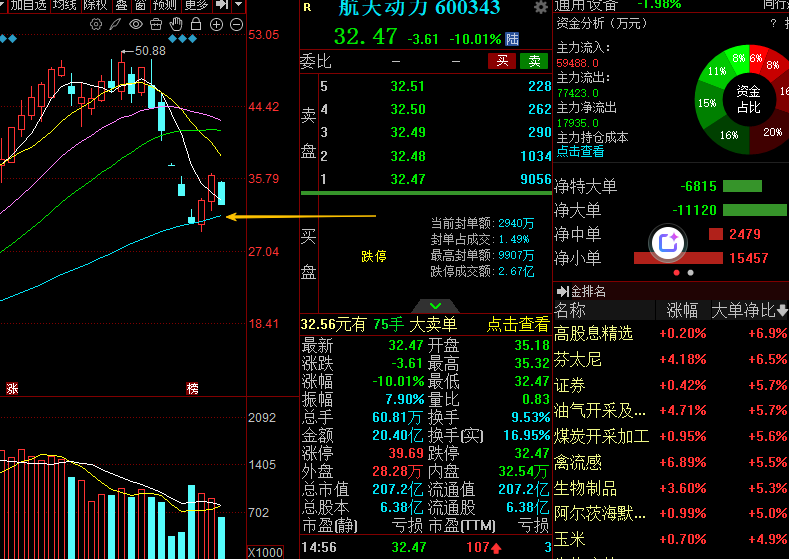 航天动力今天早盘竞价低开后迅速下跌,盘中伴随板块调整股价也逐步走落,午后更是直接被按在了地板上,前期的盈利回吐了一大半。后续若能在60日均线这个位置稳稳承接住,再叠加板块迎来回暖的话,该股还是有望再度走出修复性的行情
