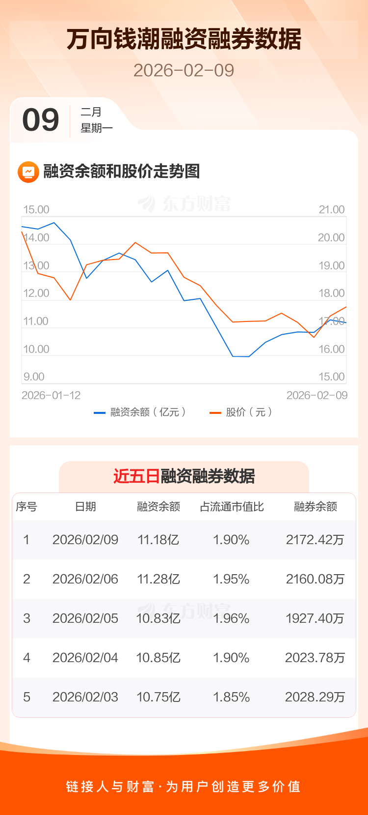 交易所最新数据显示,万向钱潮于2026年2月9日获融资买入1.53亿元,融资偿还1.63亿元,当日融资净偿还973.1万元。目前,该股融资余额11.18亿,占流通市值比例为1.90%。