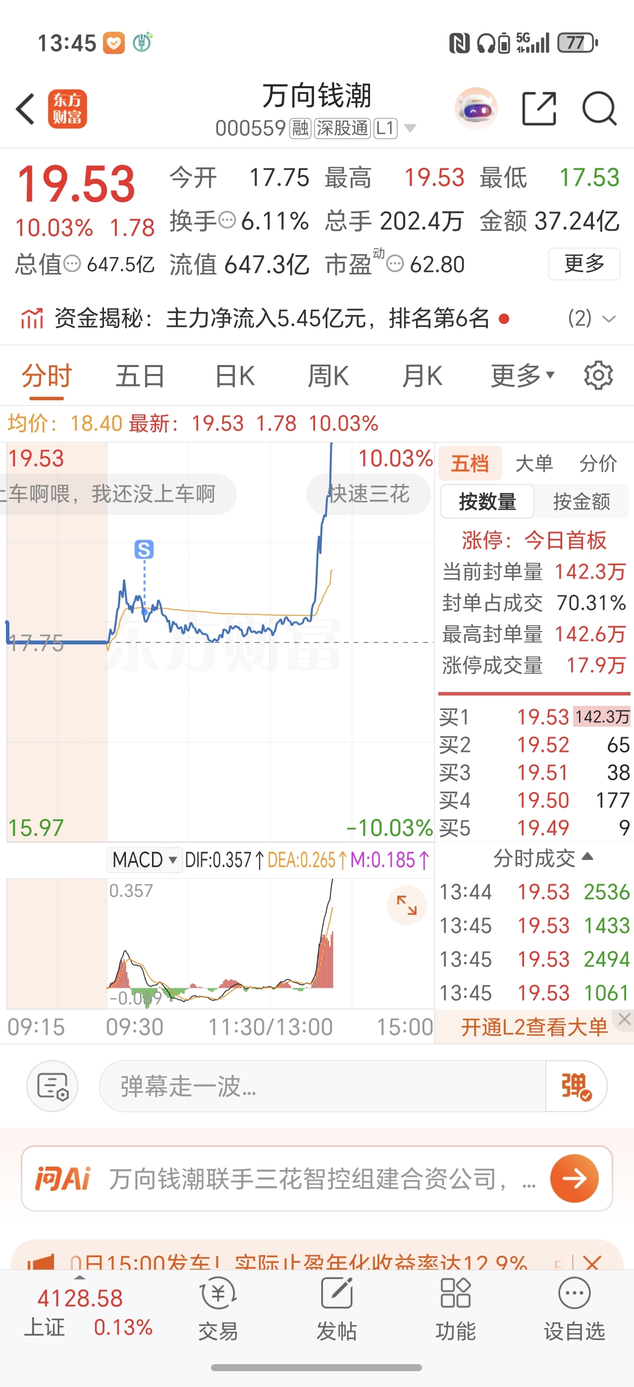 $万向钱潮(SZ000559)$ 我不明白,我持仓了十0多天都没拉