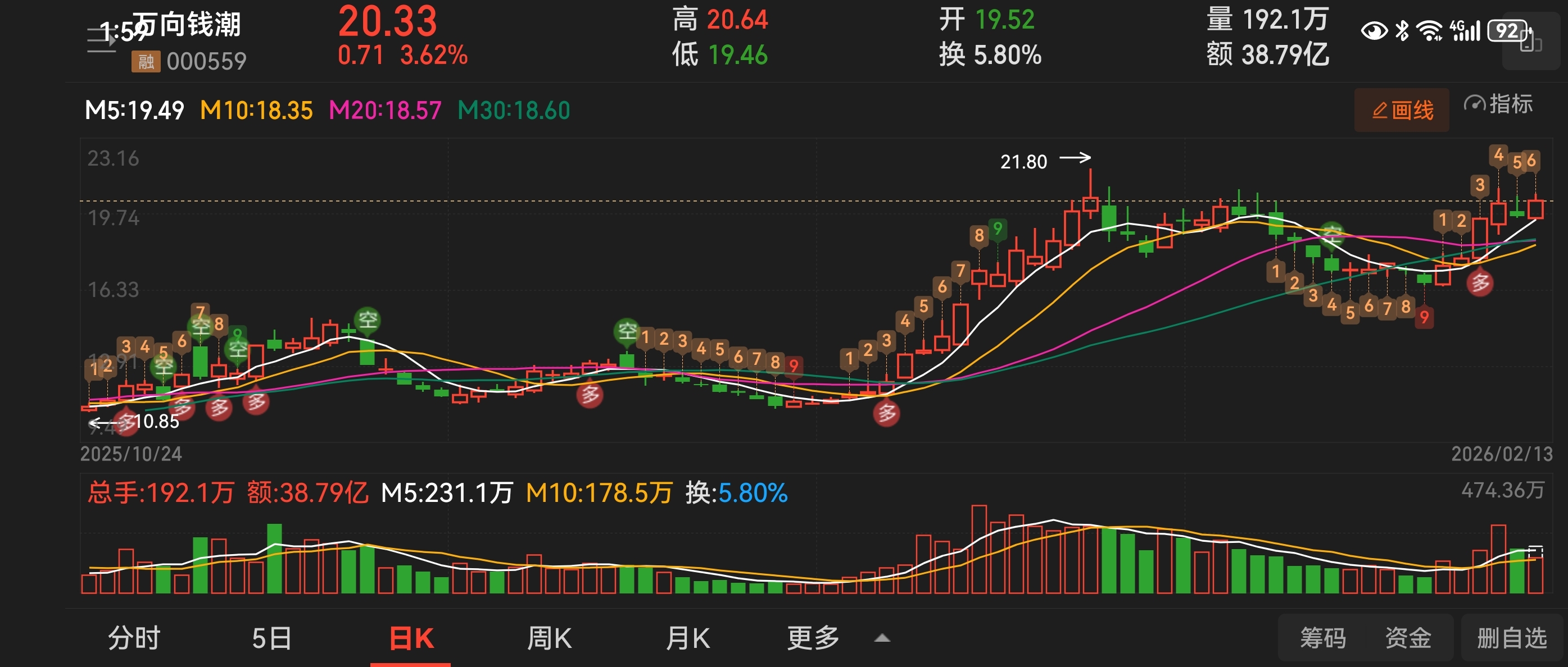 $万向钱潮(SZ000559)$ 2.11那天我做了分享,12号也是按低吸操作的,今日看看现在逻辑还在,注意观察今日是否能冲过2088!最好是能冲过去