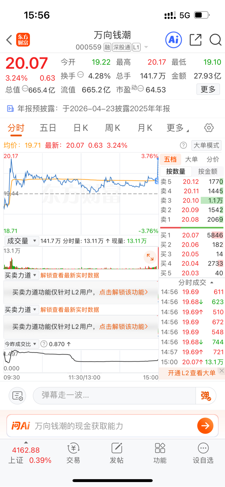$万向钱潮(SZ000559)$ 我这卖在顶峰,下周一低开买回来