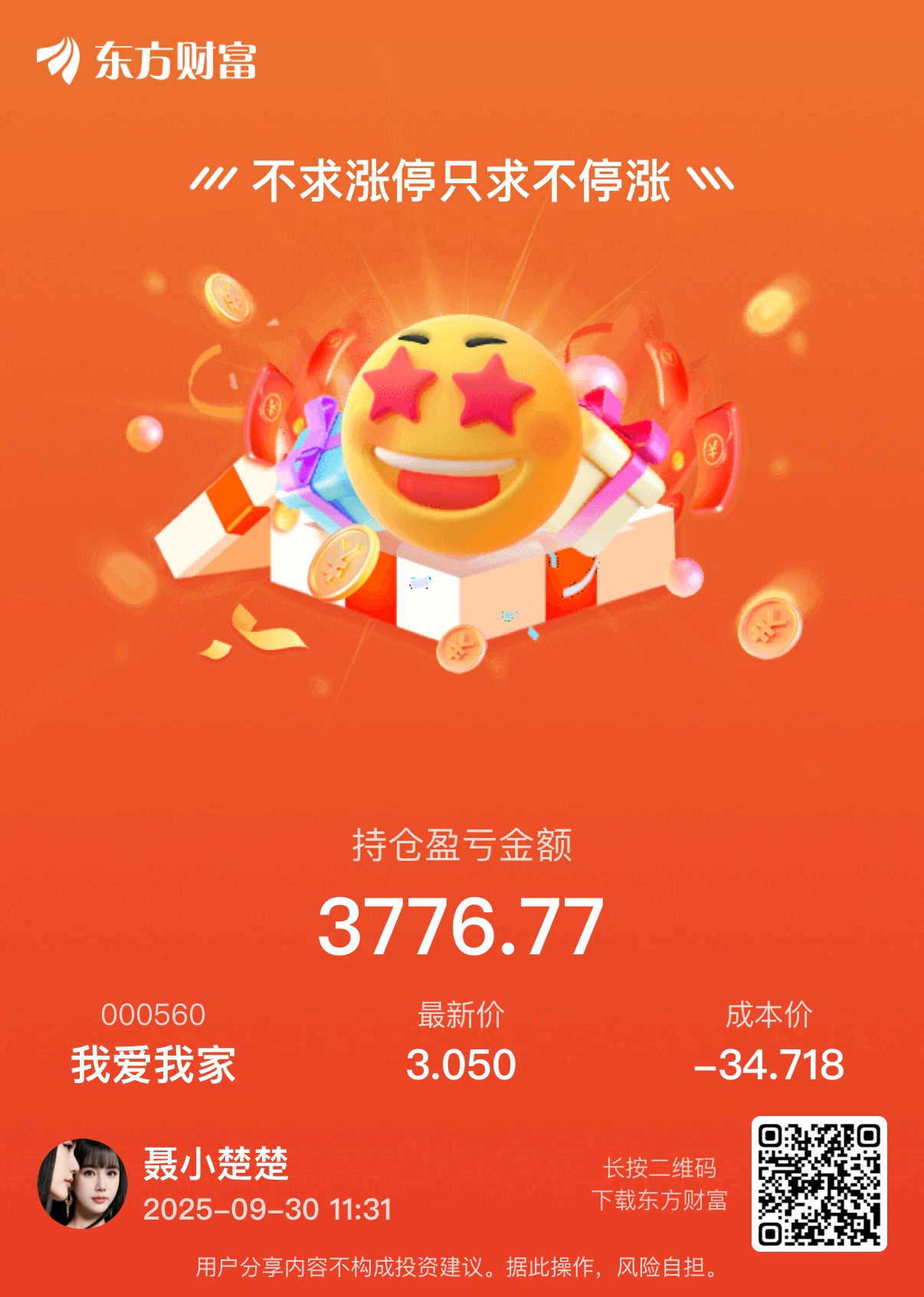 $我爱我家(SZ000560)$ 清仓了,浪费时间。留100股。做长期资本就是个天大的笑话,利润只剩三分之一了才清仓,气死宝宝了。