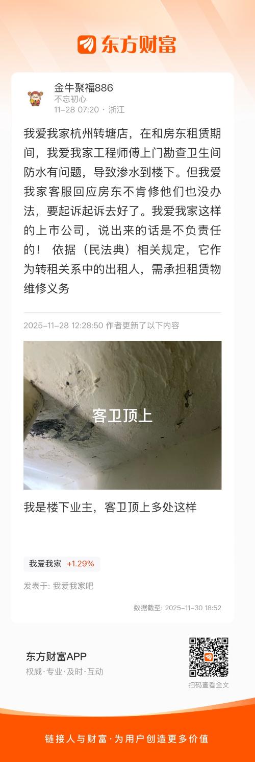 我爱我家杭州转塘店,在和房东租赁期间,我爱我家工程师傅上门勘查卫生间防水有问题,导致渗水到楼下。但我爱我家客服回应房东不肯修他们也没办法,要起诉起诉去好了。我爱我家这样的上市公司,说出来的话是不负责任的! 依据(民法典)相关规定,它作为转租关系中的出租人,需承担租赁物维修义务