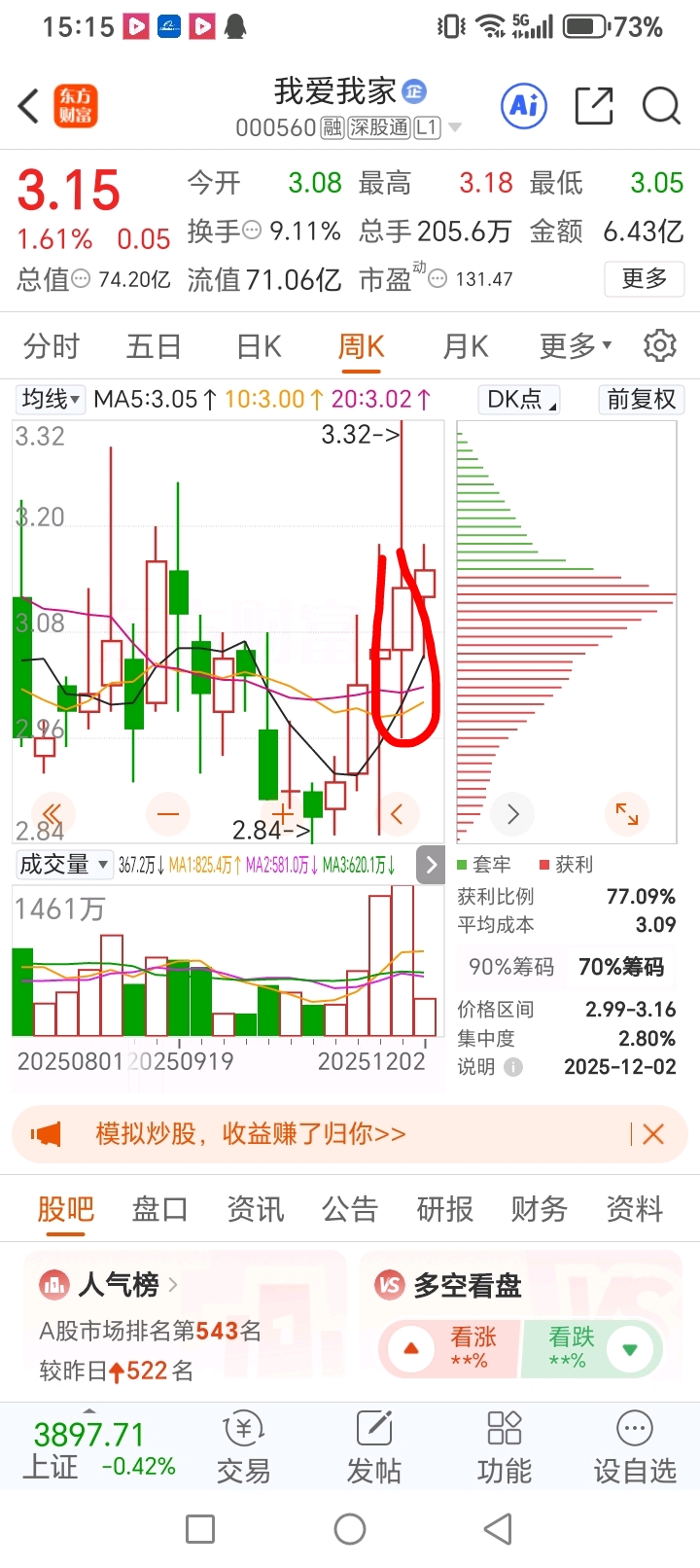 $我爱我家(SZ000560)$ 周线螺旋桨,股书讲三天能破最后一条周线的中位点3.2就有效!三天不破则失效!明天很关键了!