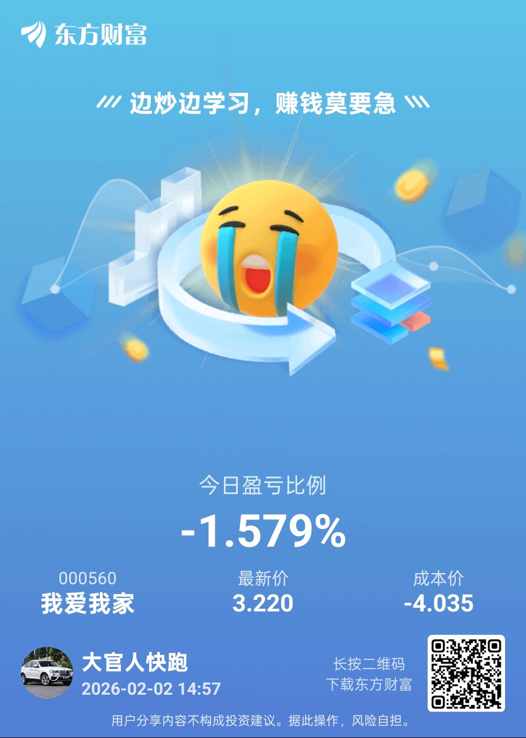 $我爱我家(SZ000560)$ 亏了1.5个点,还有比我亏的少的吗