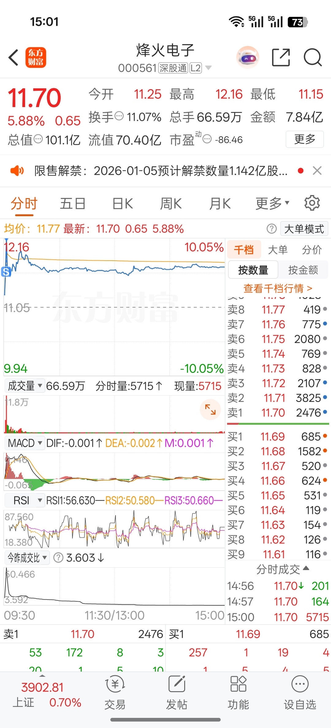 $烽火电子(SZ000561)$ 精准逃顶,涨停就卖。