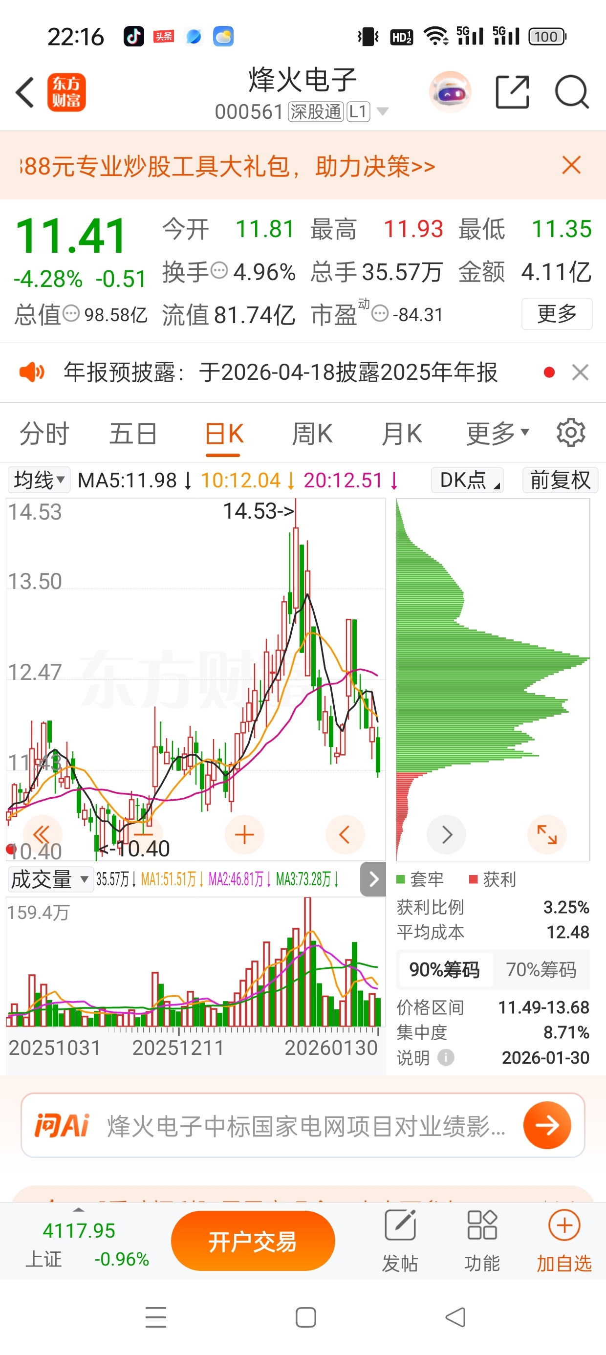 $烽火电子(SZ000561)$ 宝鸡烽火电子icon机构真是缺德,早知道2025年亏损比2024年亏损翻倍,一个月前却借着商业航天概念,一口气把股价从11元一线拉到15元以上。随着商业航天概念退潮,反身大跳水,一直创出回调新低,直到今天晚上业绩公布。令人不解的是,之前一直豆包搜索结果是2025年由盈转亏,想不到实际结果可能亏损每股0.28元左右。看来豆包搜索也不可信,也是一处陷阱啊!