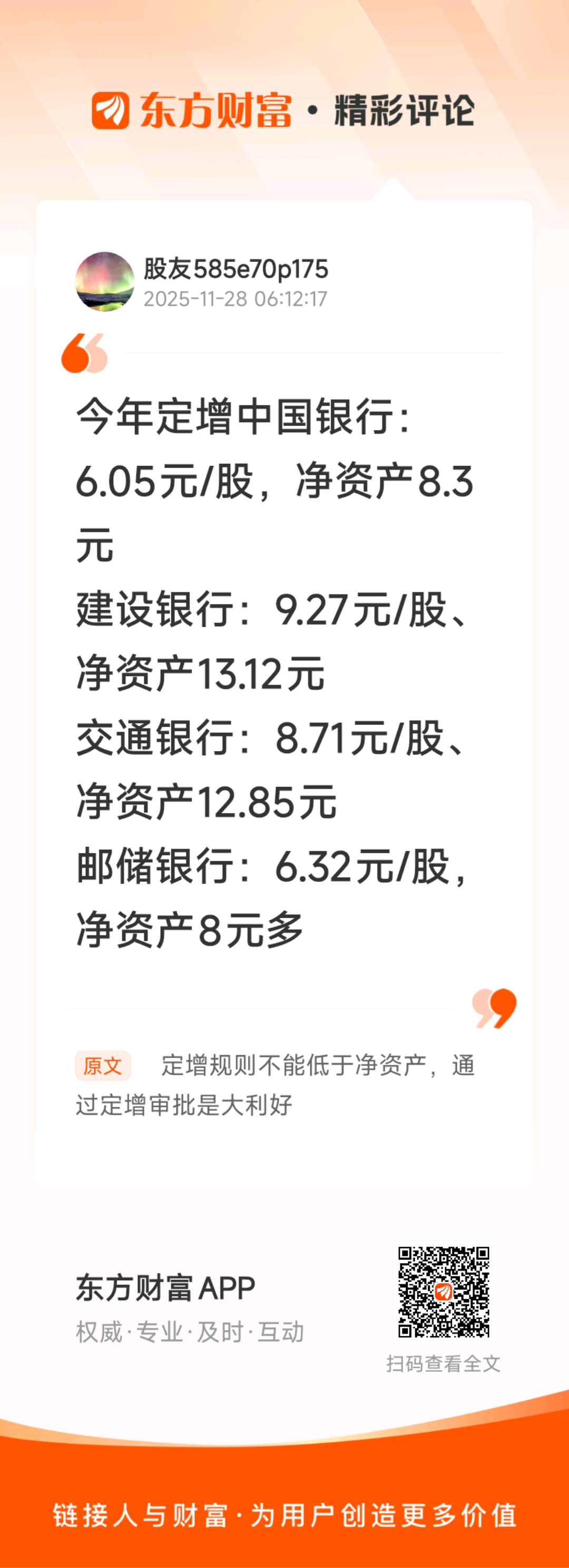 //@股友585e70p175 :今年定增中国银行:6.05元/股,净资产8.3元建设银行:9.27元/股、净资产13.12元交通银行:8.71元/股、净资产12.85元邮储银行:6.32元/股,净资产8元多