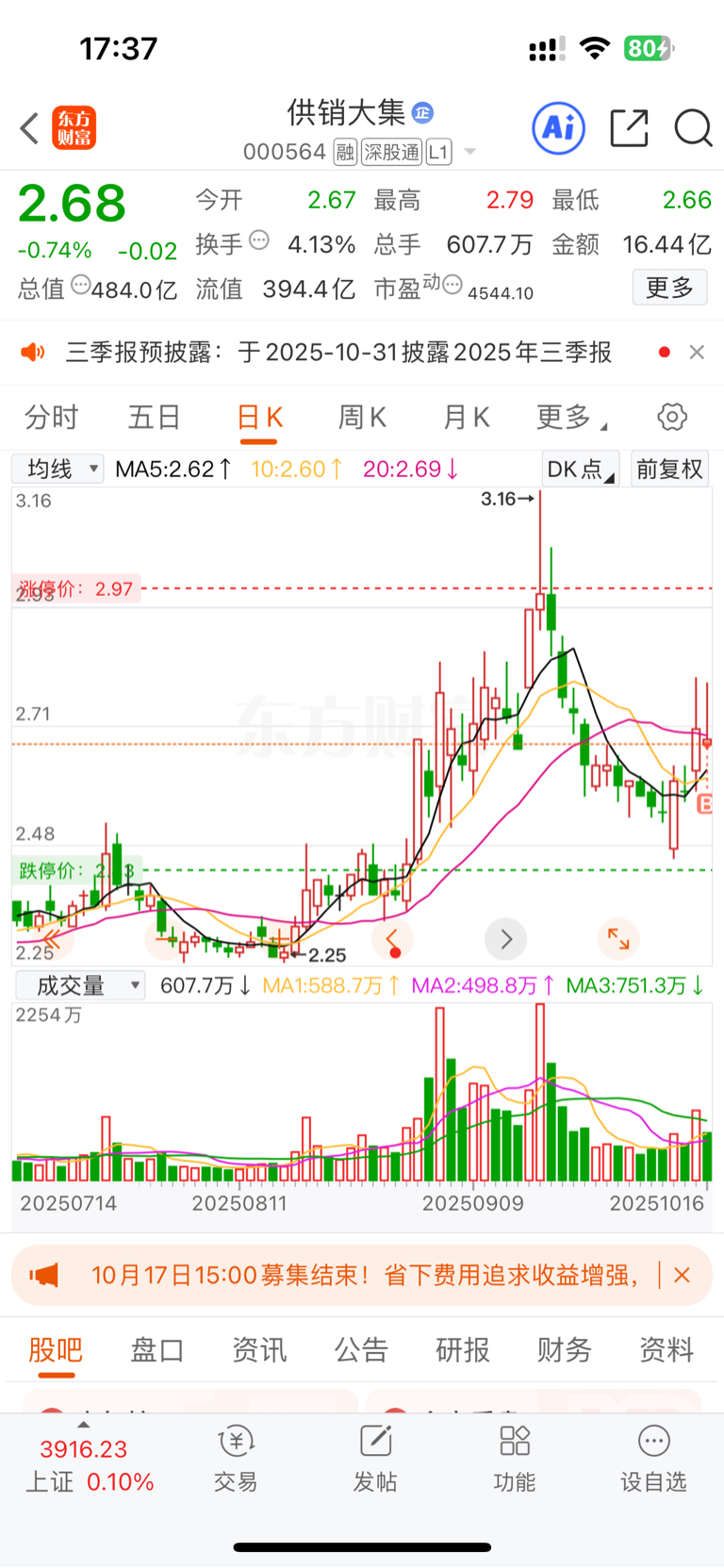 $供销大集(SZ000564)$ 希望明天有肉吃