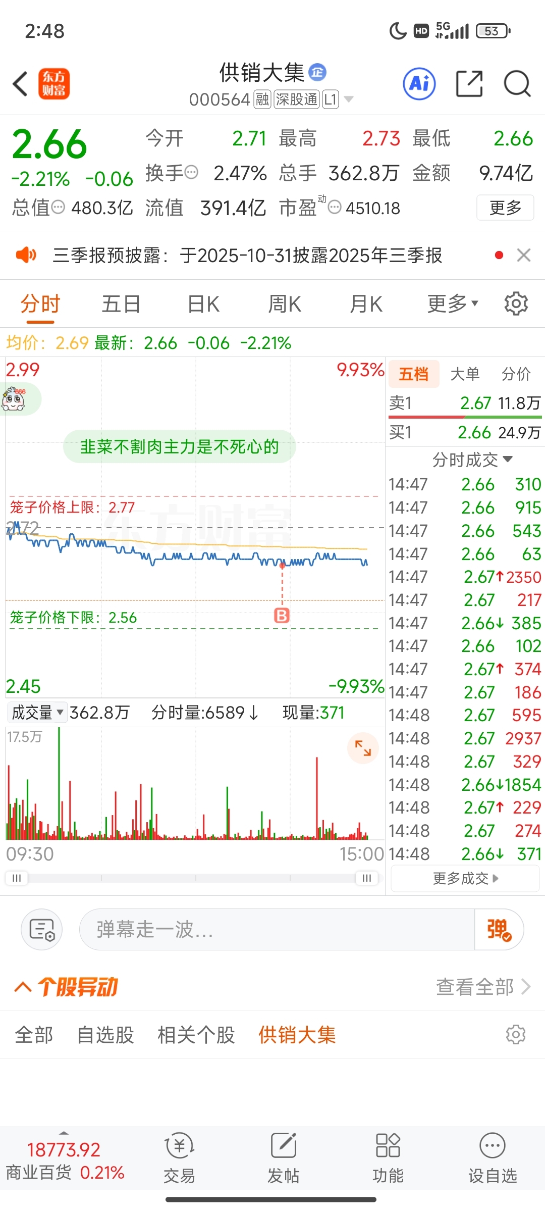 $供销大集(SZ000564)$ 己建仓三成仓位,亏五个点补三成,只拿三个月,年底再见