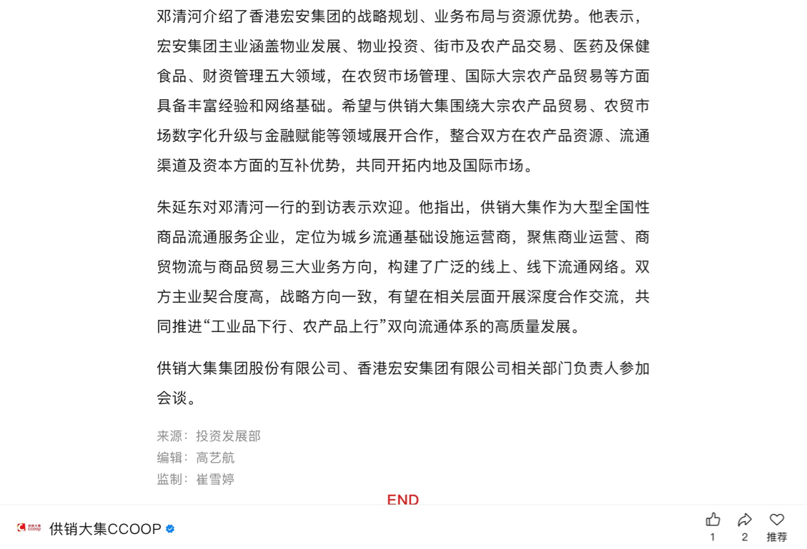 香港宏安集团在农贸市场管理、国际大宗农产品贸易等方面具备丰富经验和网络基础,和大