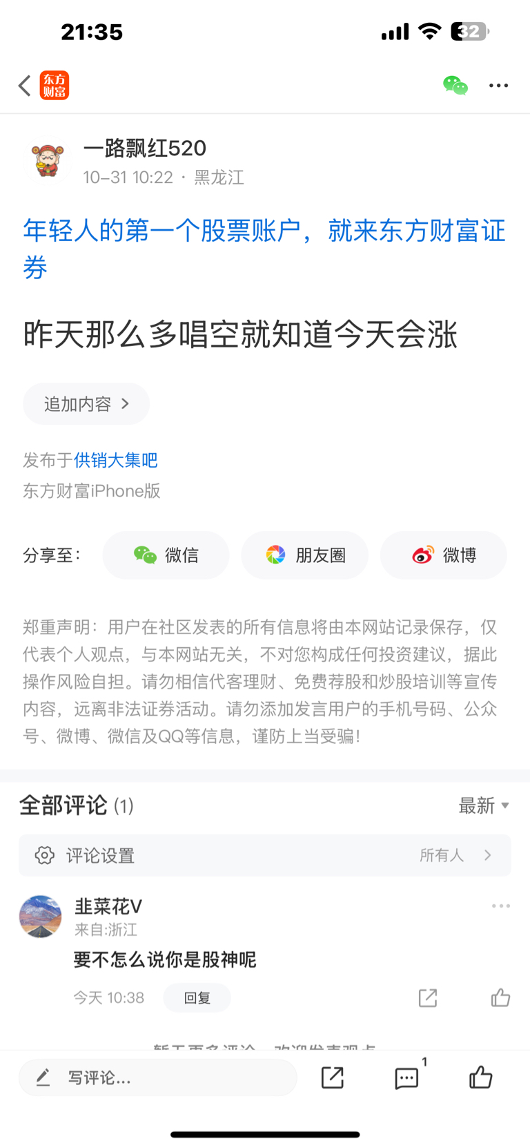 温馨提示: 1.根据《证券法》规定,禁止编造、传播虚假信息或者误导性信息,扰乱证券市场;2.用户在本社区发表的所有资料、言论等仅代表个人观点,与本网站立场无关,不对您构成任何投资建议。用户应基于自己的独立判断,自行决定证券投资并承担相应风险。《东方财富社区管理规定》
