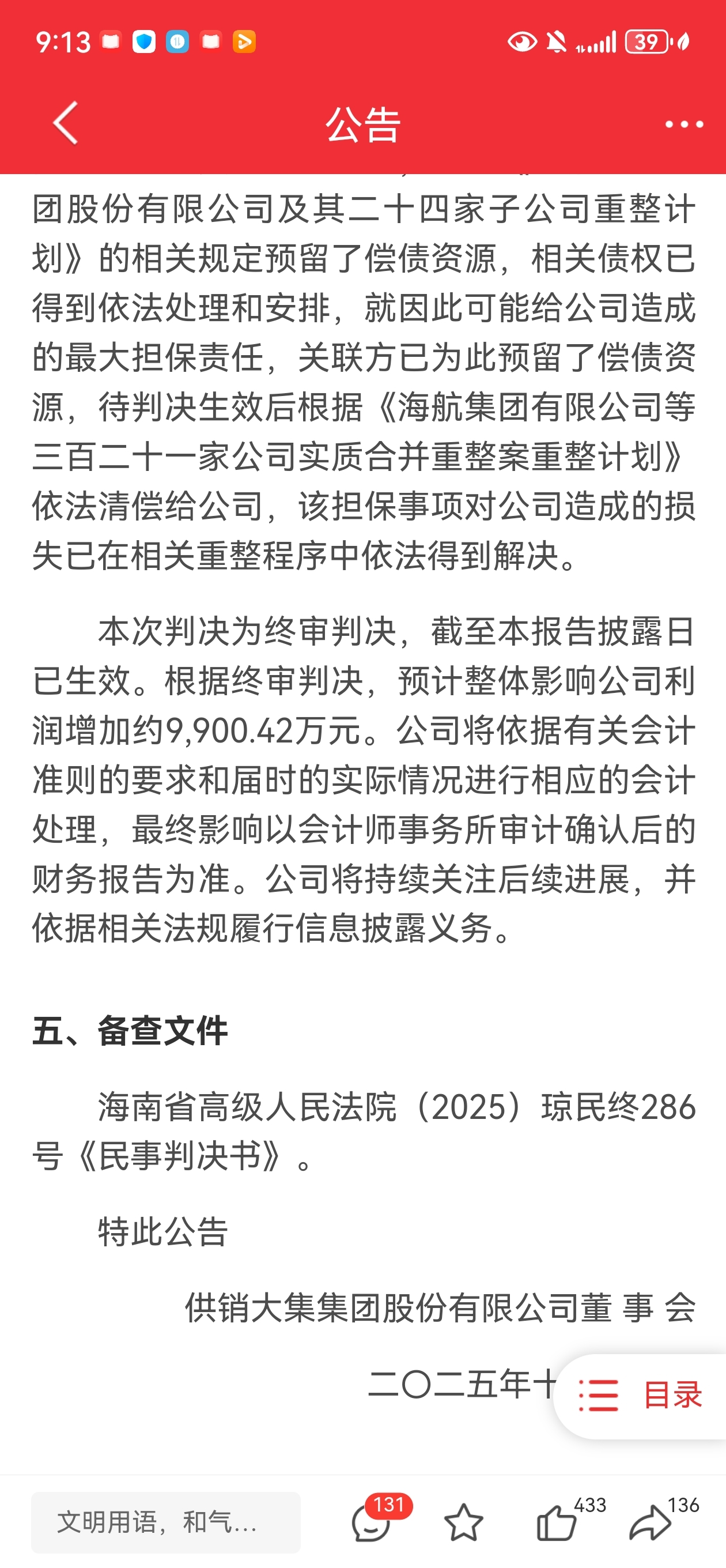 诉讼终审,供销大集利润预估增加9千9百万元。