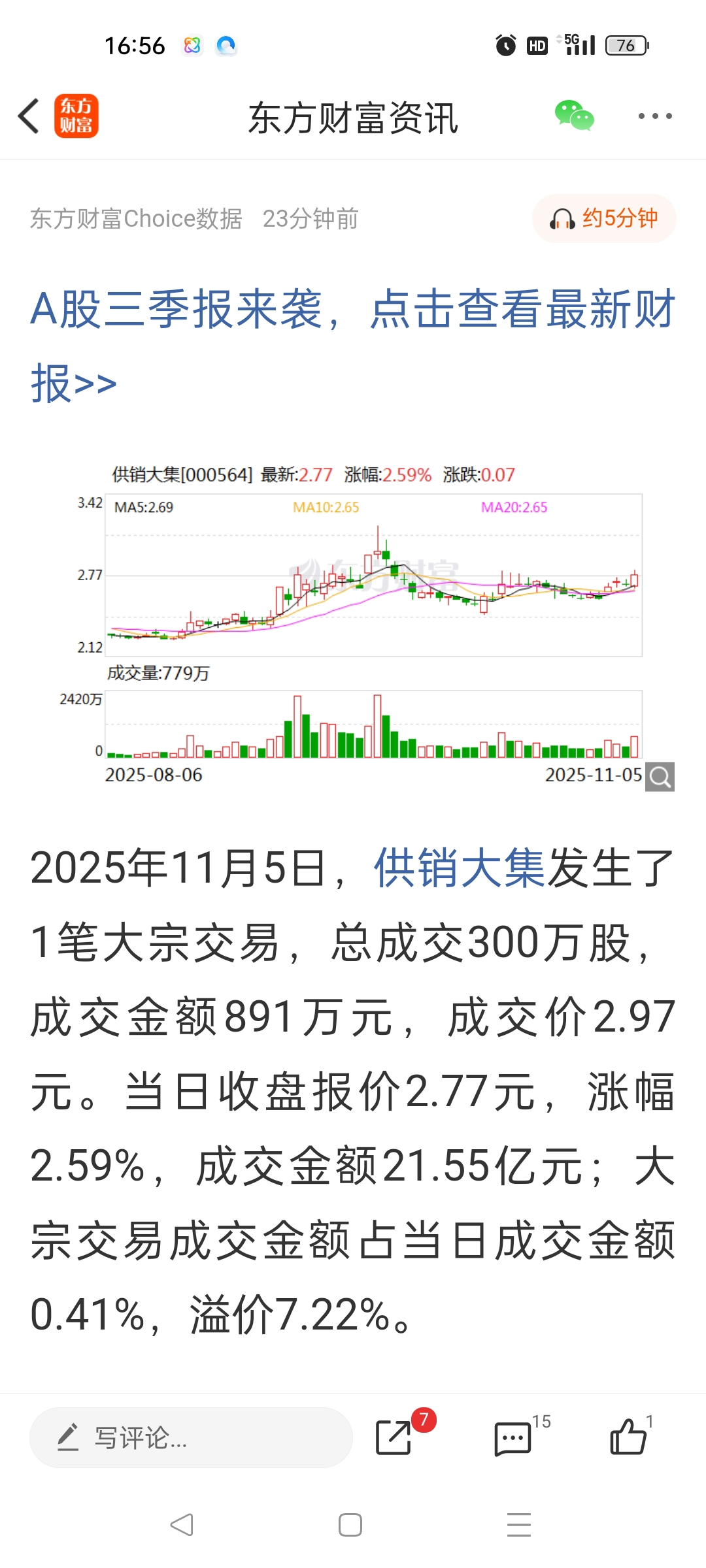 $供销大集(SZ000564)$ 盘中2.69,2.70不能买吗?2.97大宗交易,这是要连板吗?还是吸引散户接盘?