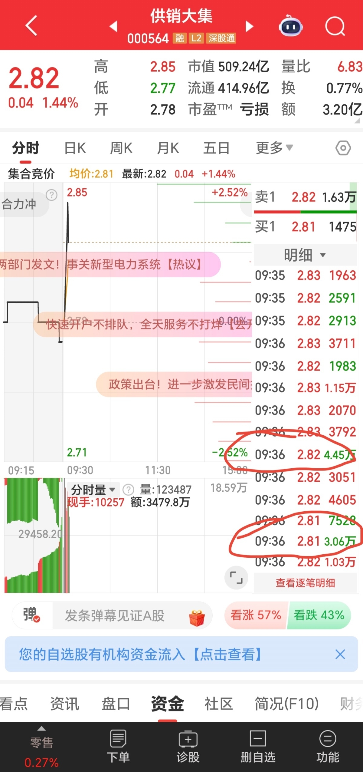 $供销大集(SZ000564)$ $供销大集(000564)$ 小单进,大单出,明显的拉高出货,大家自己看着办吧!