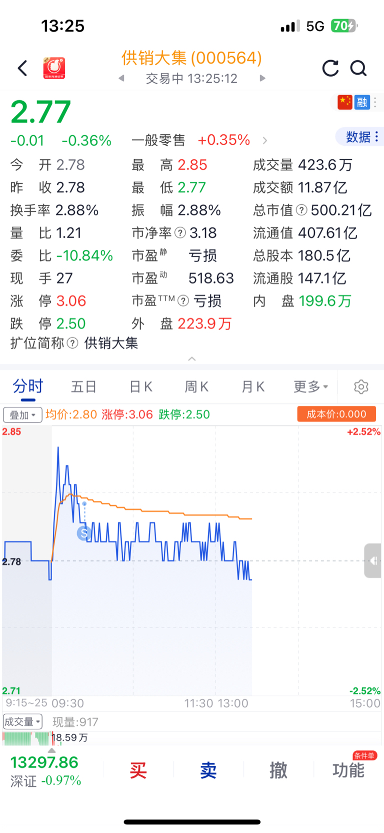 $供销大集(SZ000564)$ 早上起晚了,不然应该能多卖3毛的!2.7附近再接回来!