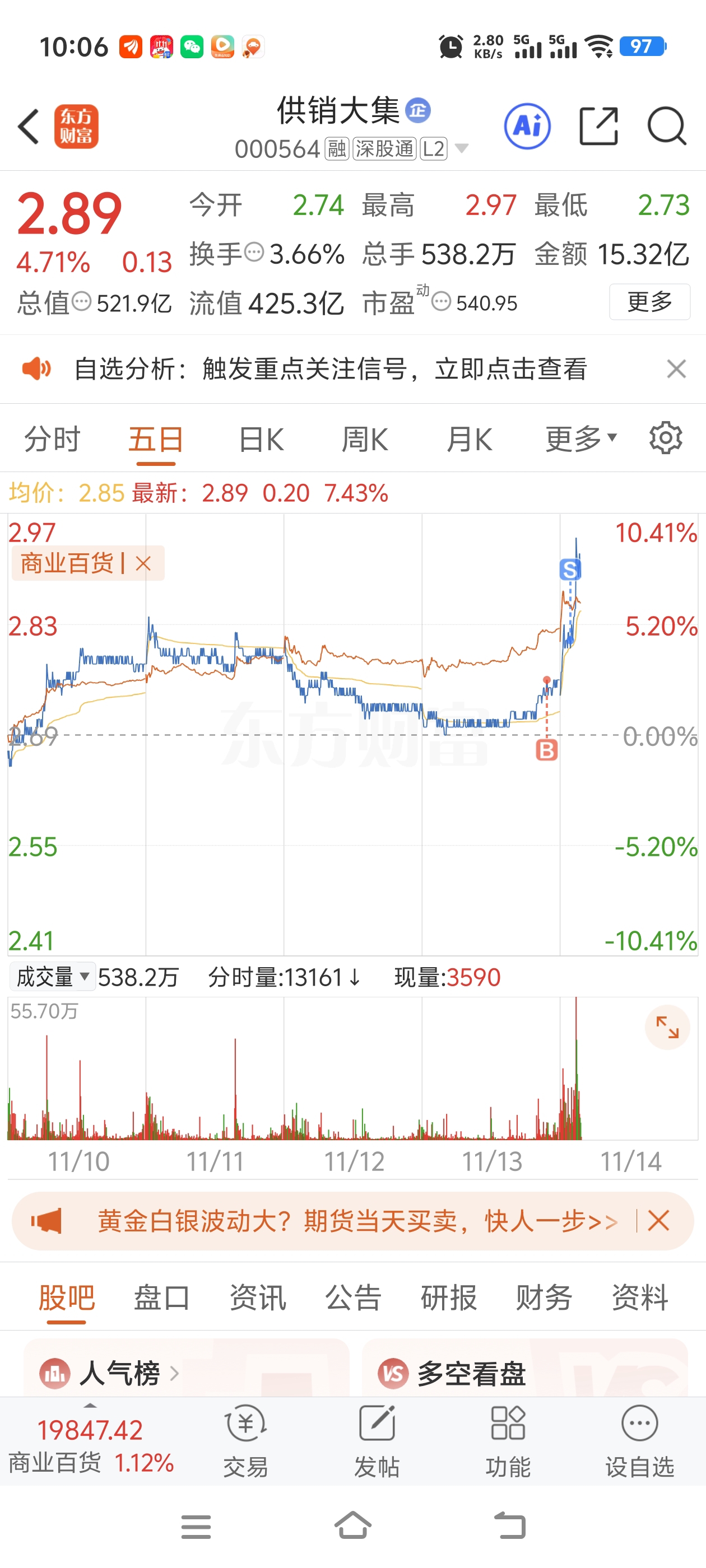 $供销大集(SZ000564)$ 大肉没吃到喝了点汤