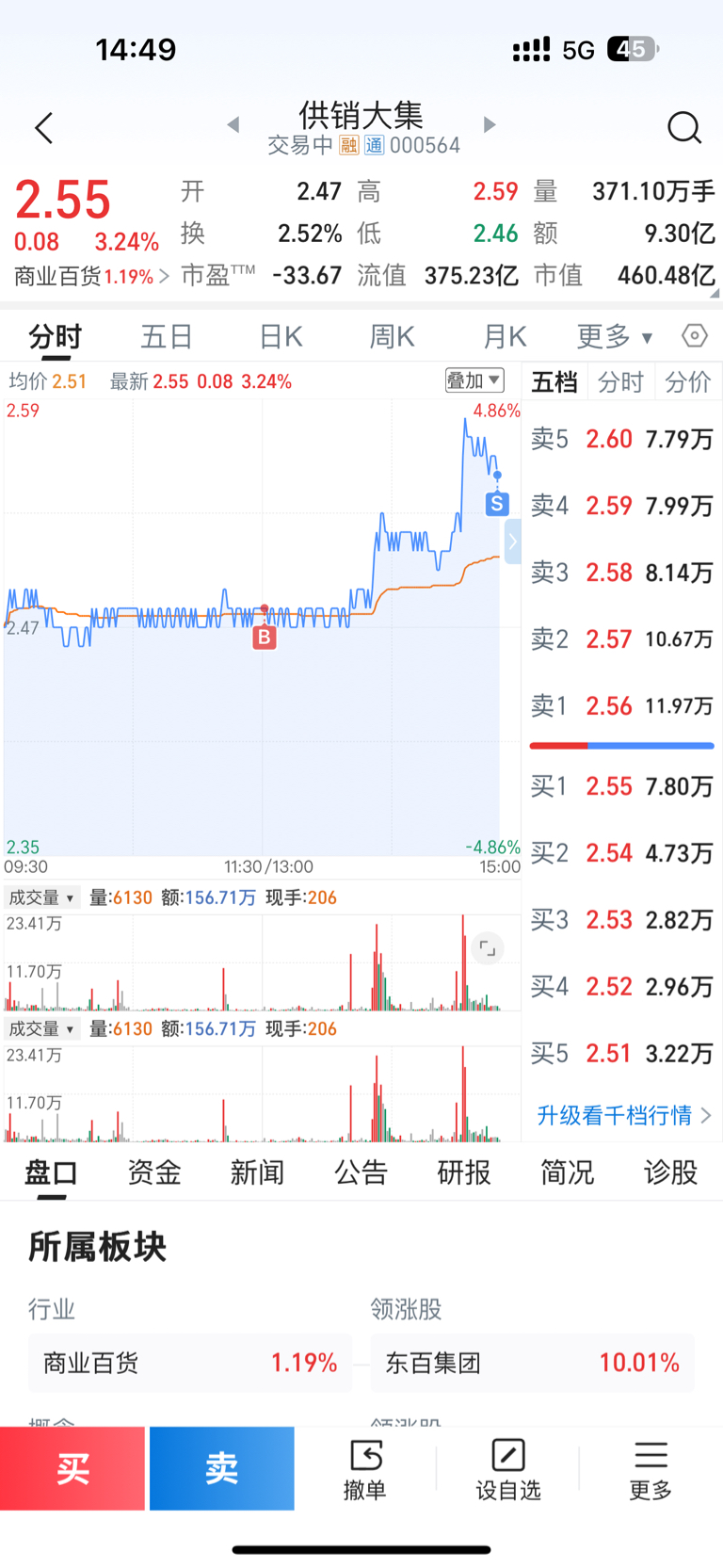 $供销大集(SZ000564)$ 今天任务完成,明天见