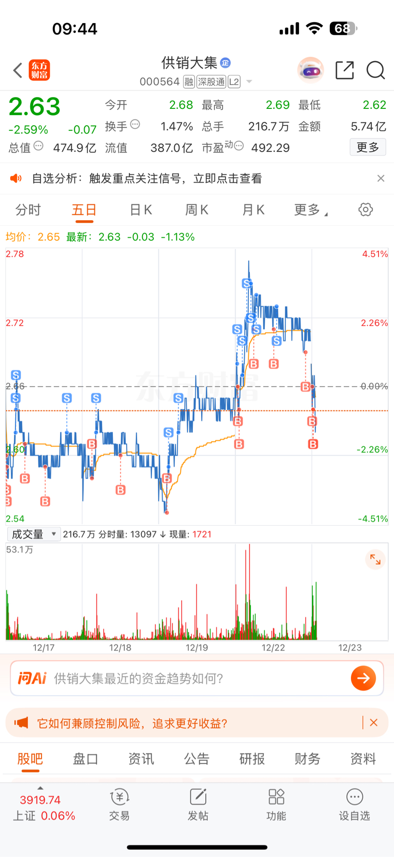 $供销大集(SZ000564)$ 昨天挣了2万今天直接亏钱,后面删自选再也不见