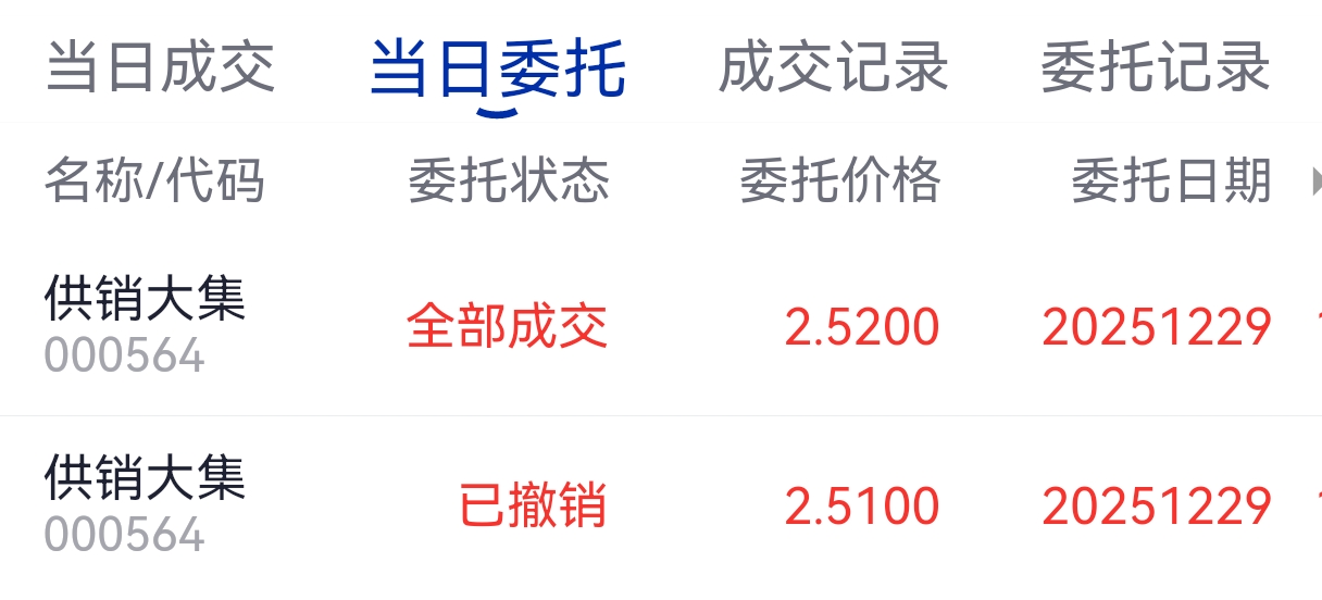 $供销大集(SZ000564)$ 昨晚上挂的2.51,上午耐不住撤单2.52买了,1分钱也是爱啊!可惜了