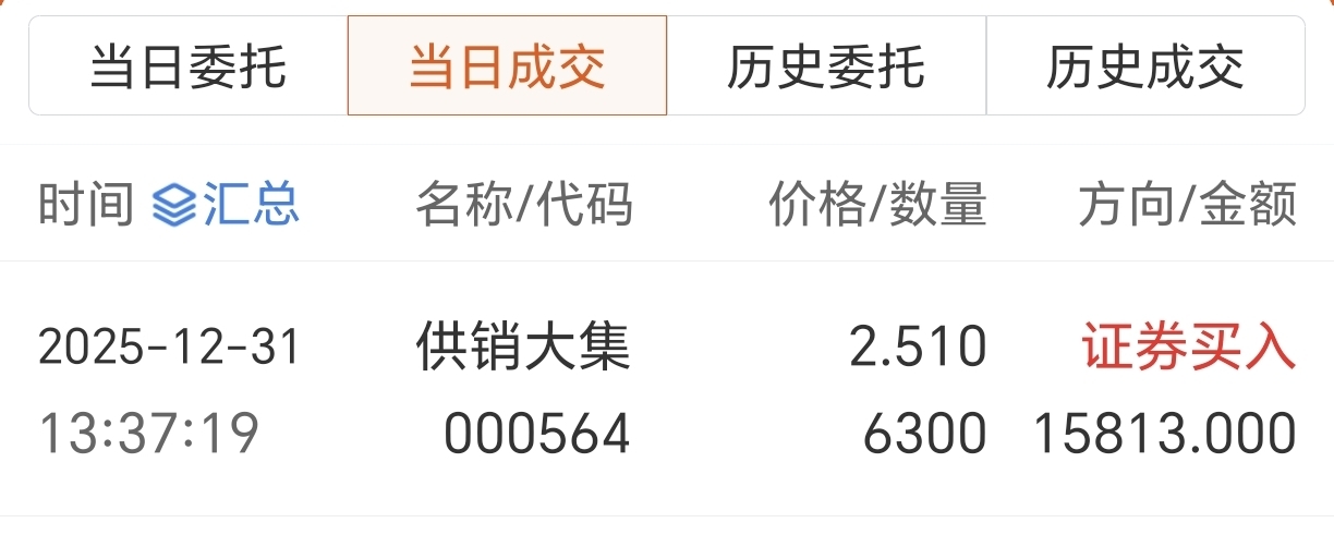 $供销大集(SZ000564)$ 开一个帖子更新大集操作,今天是2025年的最后一天了,今年大集收益远远不及预期,2026年,只做大集!