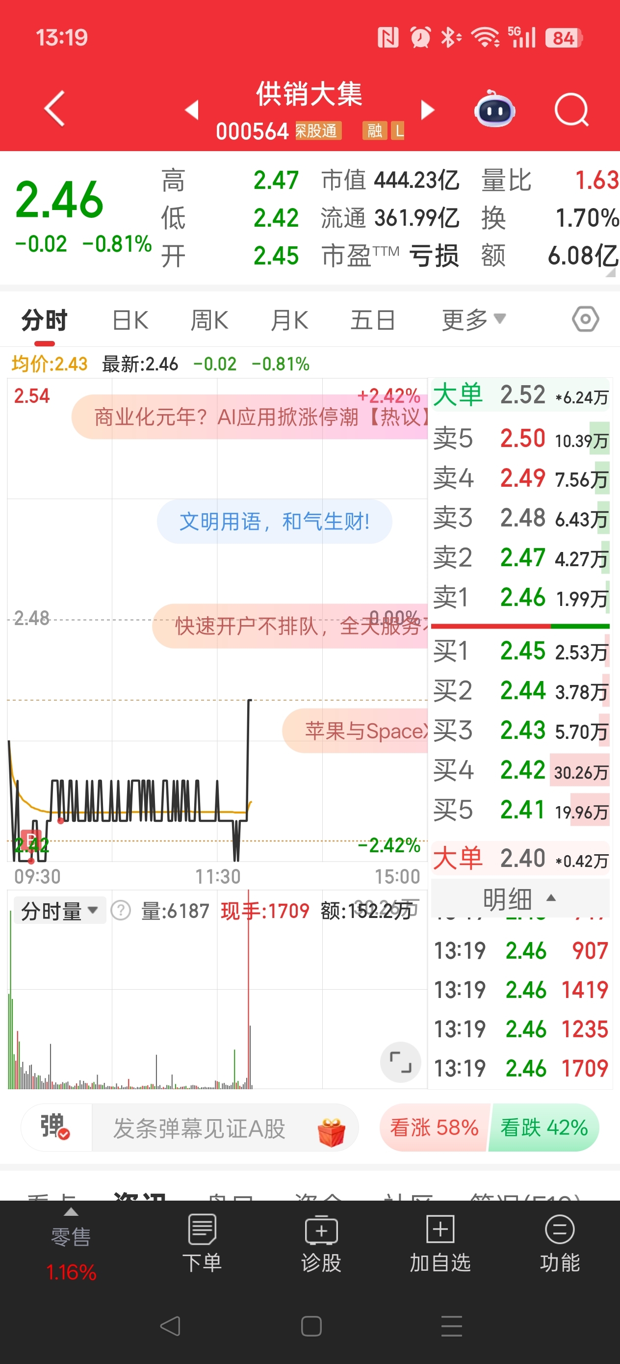 $供销大集(SZ000564)$ 昨天2.51卖了今天242接回