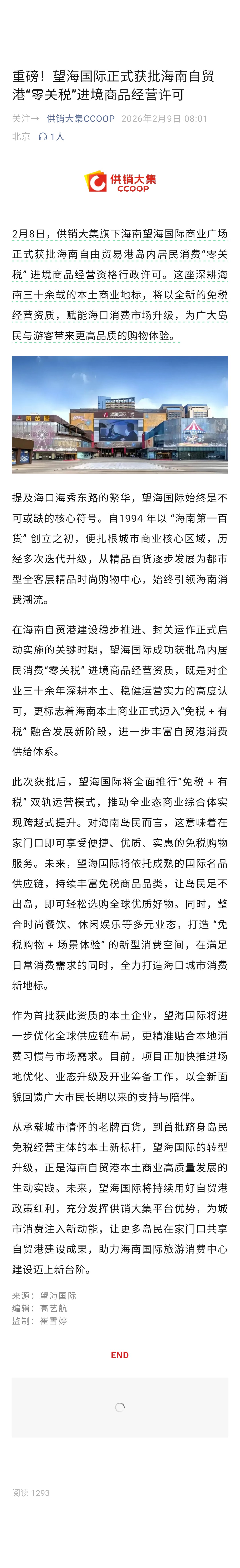 $供销大集(SZ000564)$ 重磅!望海国际正式获批海南自贸港“零关税”进境商品经营许可