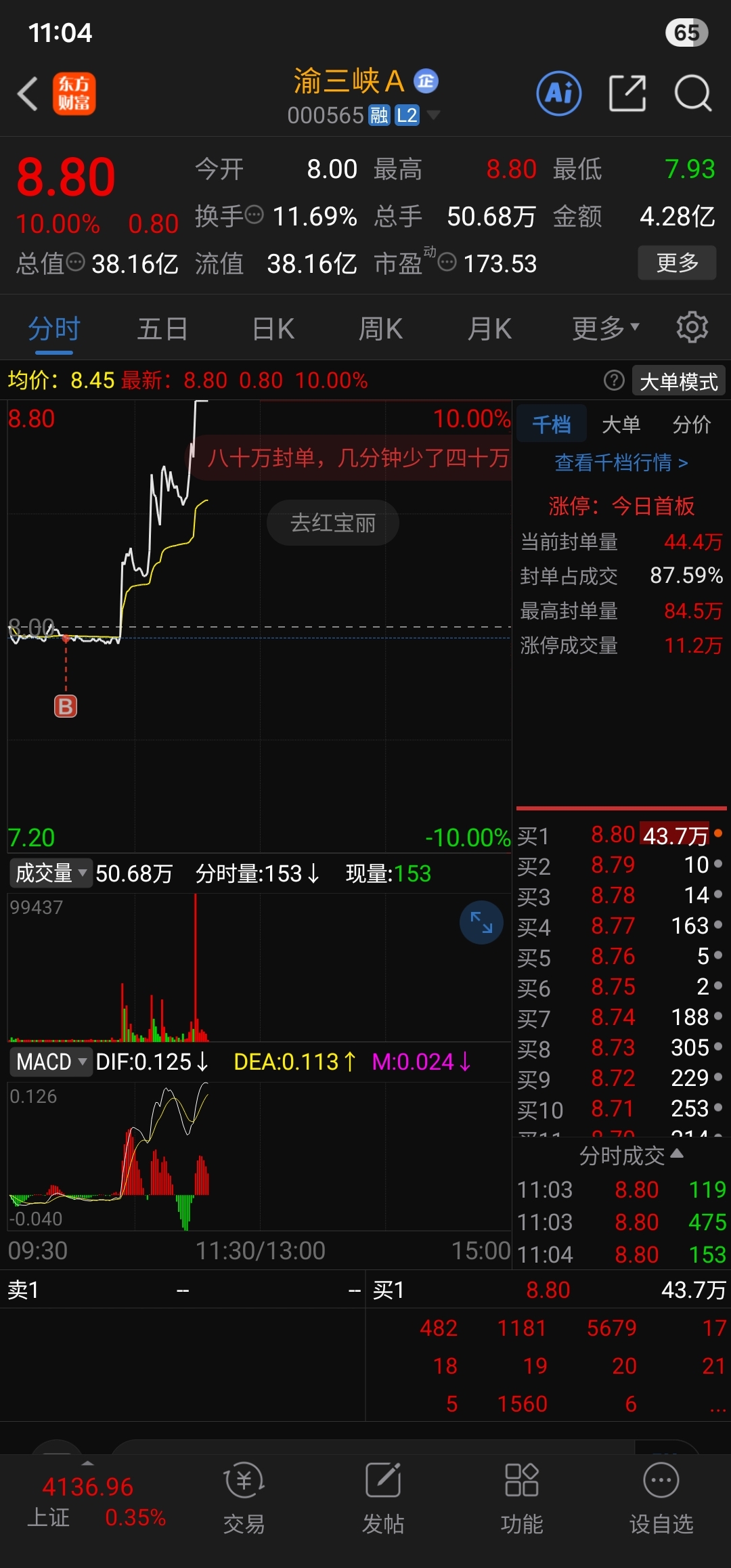 $渝三峡A(SZ000565)$ 精准抄底!