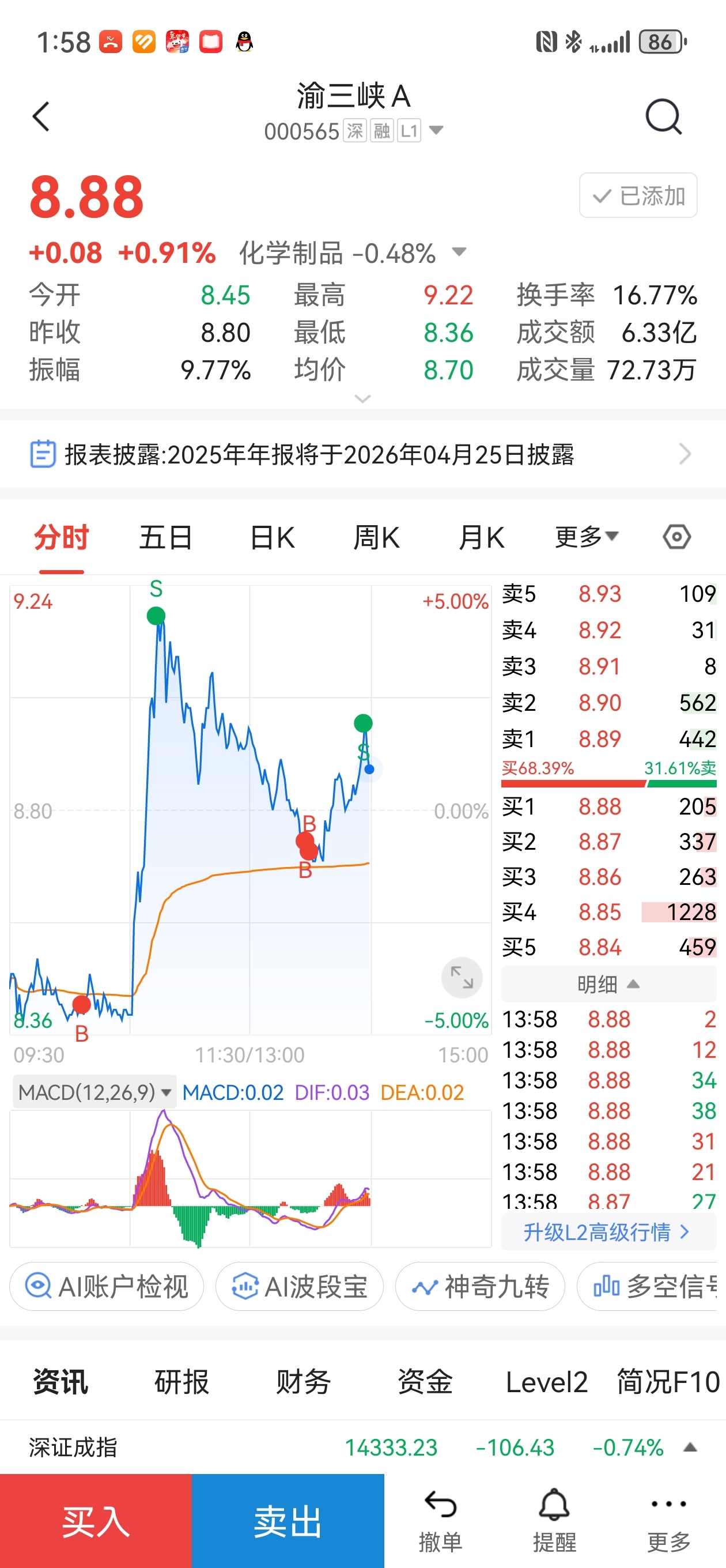 $渝三峡A(SZ000565)$ 只能T一下子了