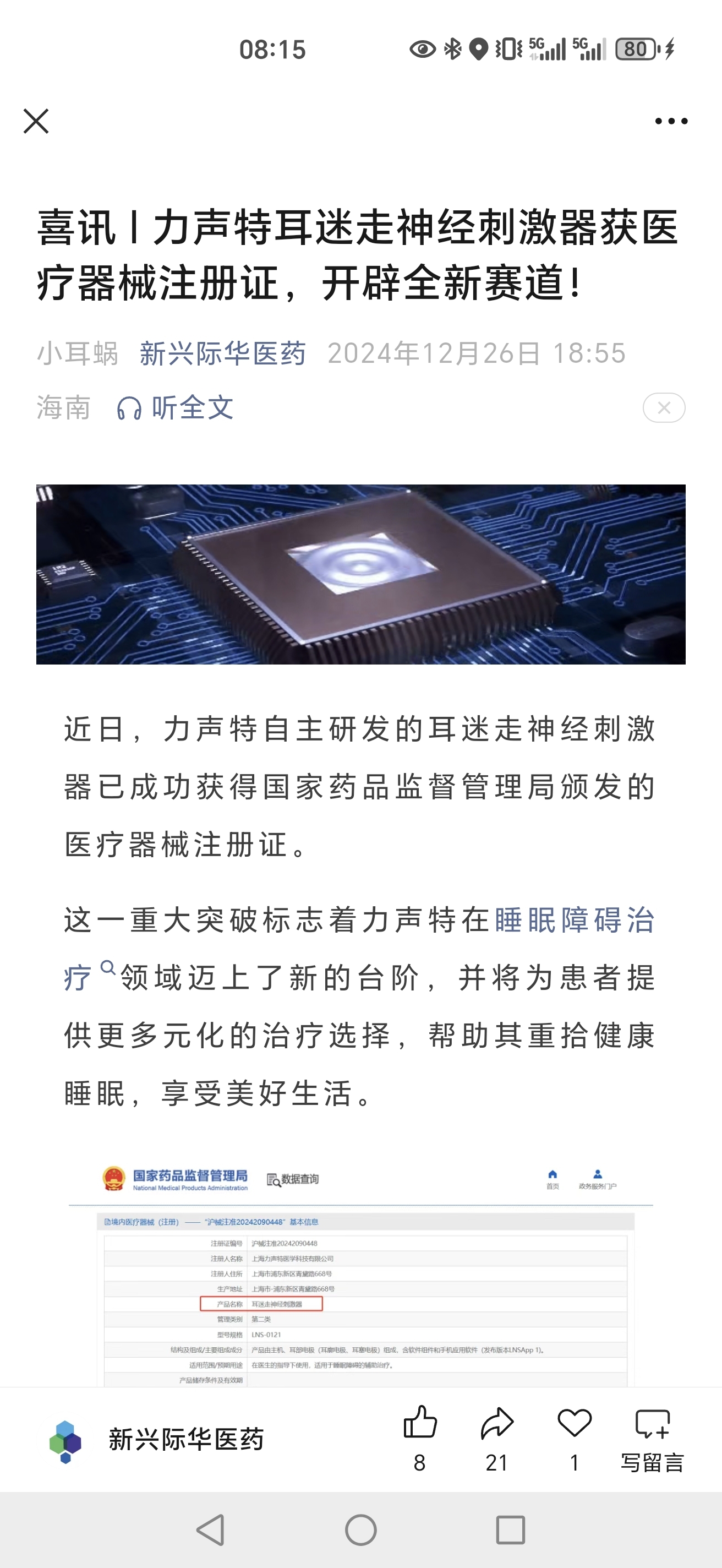 海药占股35%的力声特,有个迷走神经治疗睡眠障碍的专利。该技术还可以治疗癫痫。睡