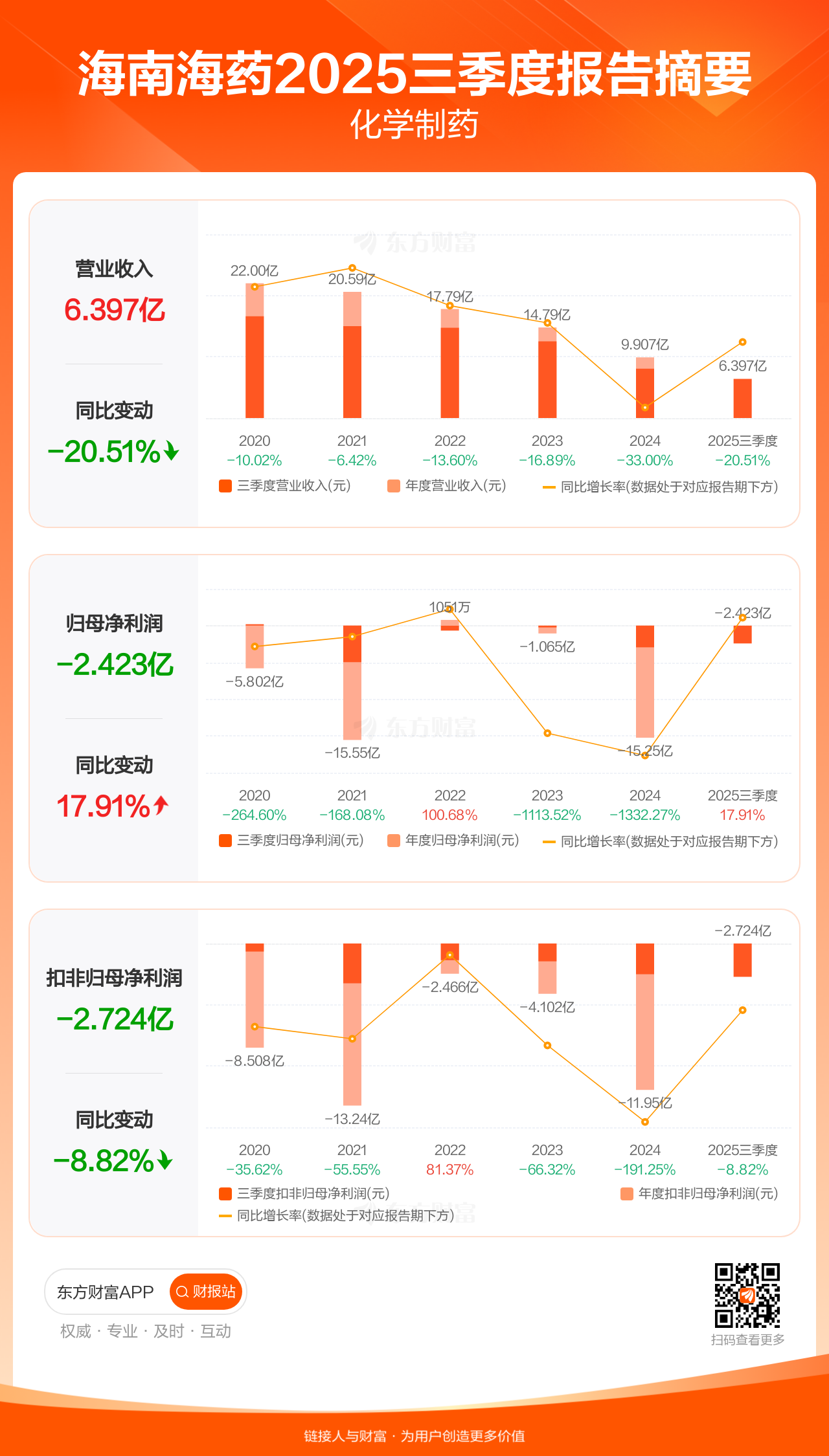 海南海药10月30日发布2025年三季报显示,公司前三季实现营业收入6.40亿元,同比下滑20.51%;归母净利润-2.42亿元;扣非归母净利润-2.72亿元