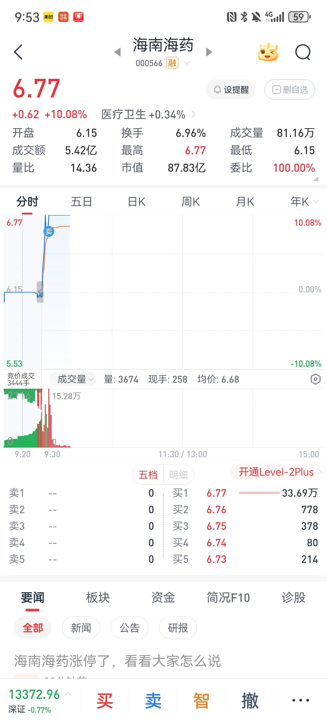 $海南海药(SZ000566)$ 今天有没有做t的大神