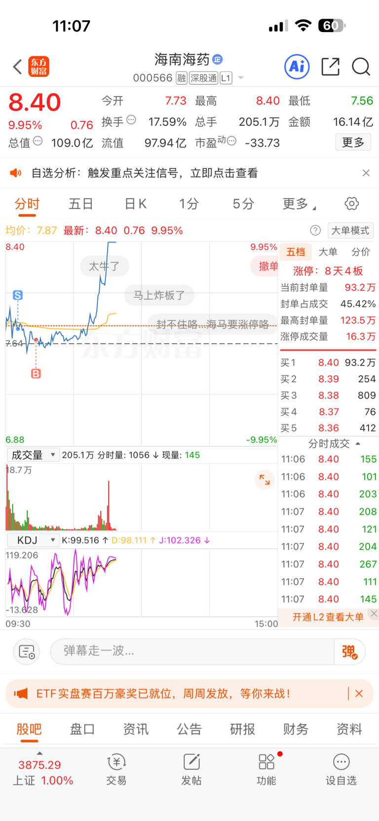 $海南海药(SZ000566)$ 不骗你们,单吊一只票满仓涨停,但我这个月还没回本