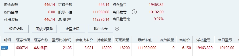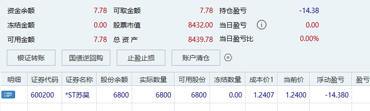 今天午休盘中部分账户持仓,所有的账户基本上满仓了600734,只有两个账户进了一点600200,进的不多,就是博它不退市翻10倍,退市了最多亏一半,我很少做ST,这次就想以小博大,这个公司我非常了解,就是退市,股价仍然值5元,在新三板里面仍然可以翻10倍,不相信咱们走着瞧。