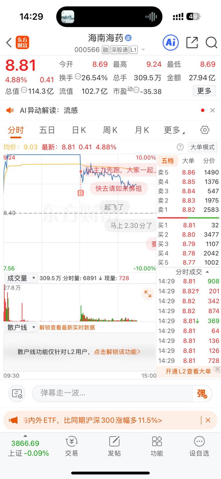 $海南海药(SZ000566)$ 我本想打板的,这样想的话还少亏两个点