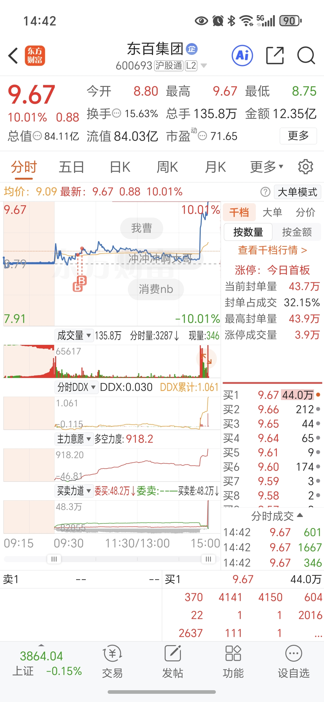 完美20%,早上就说了,这个是龙三,不能开,一开必跑。卖了你,我去买了东百集团
