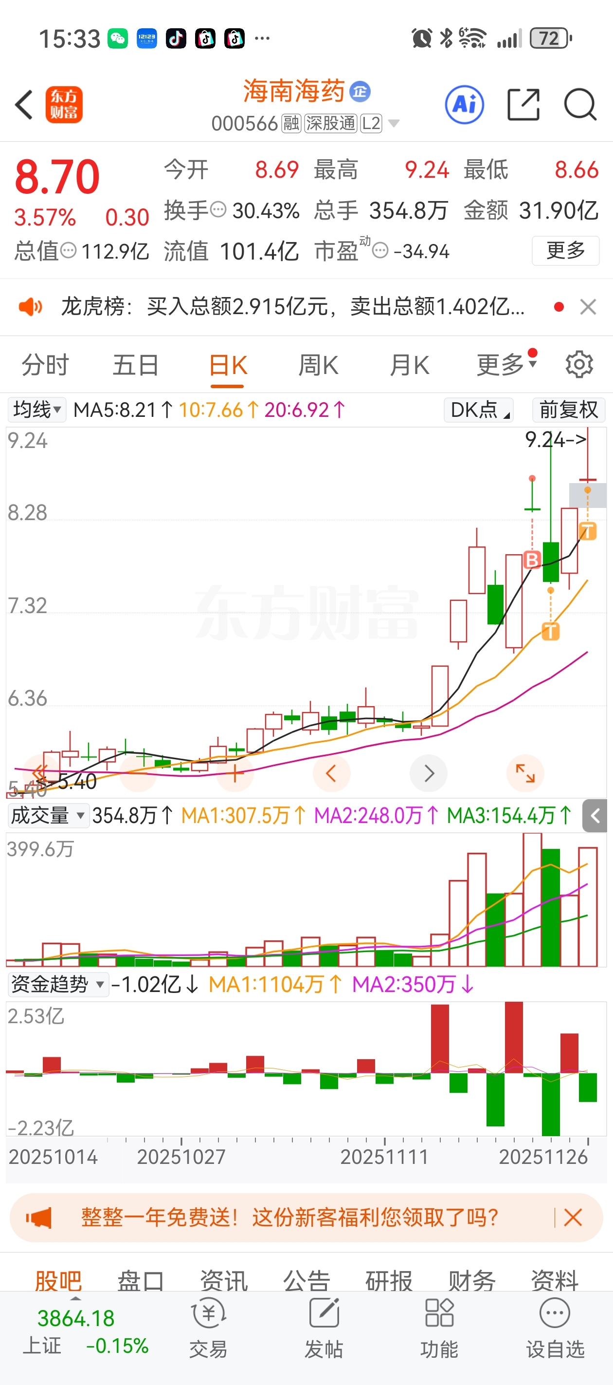 $海南海药(SZ000566)$ 惨,怎么会炸板,板上加什么仓啊!