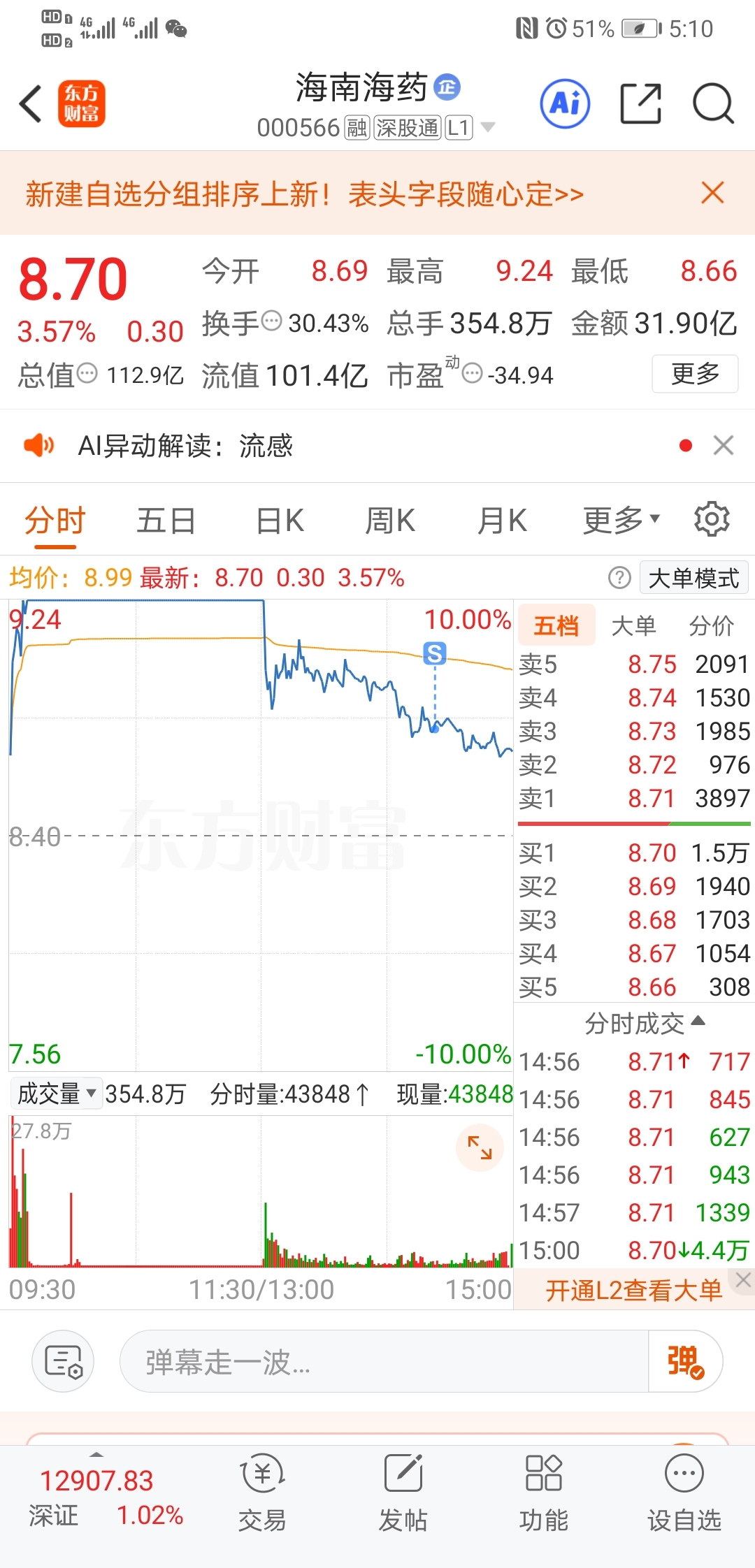$海南海药(SZ000566)$ 中午看到那个11万手的卖出单就该跑的,中午睡一觉炸这么狠
