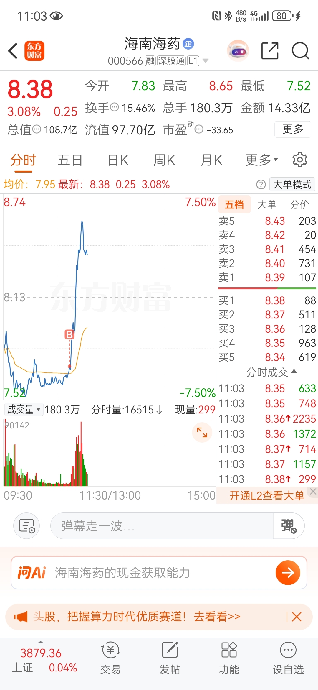 $海南海药(SZ000566)$ 感谢主力让我吃到肉,主力发财。
