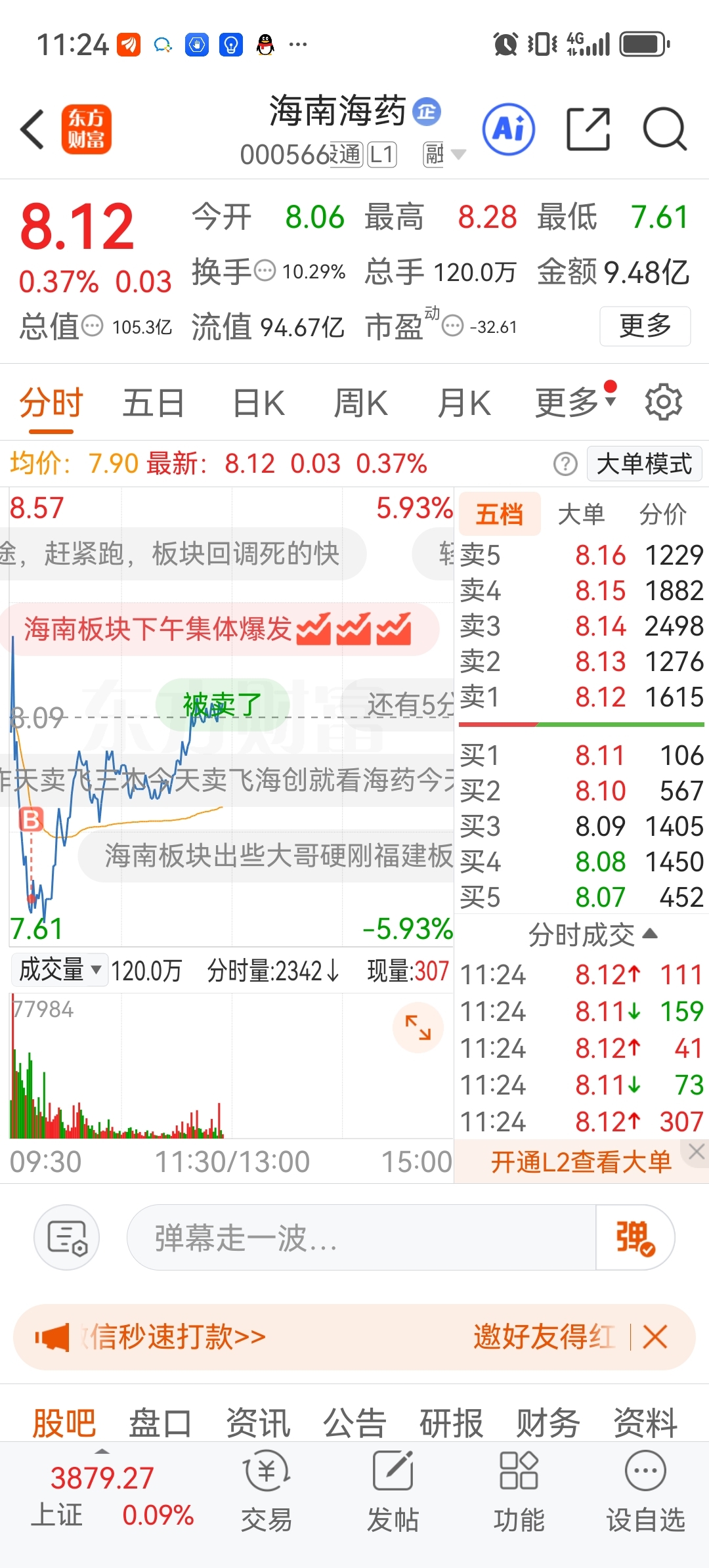$海南海药(SZ000566)$ 今天能不能搞一条华子