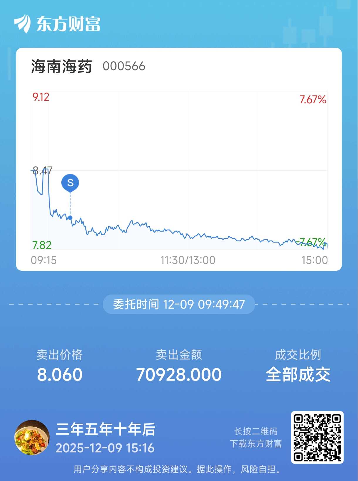 $海南海药(SZ000566)$ 及时止损,这庄家心太坏了,全天水下,早盘还是跑慢了,居然最低点收盘。