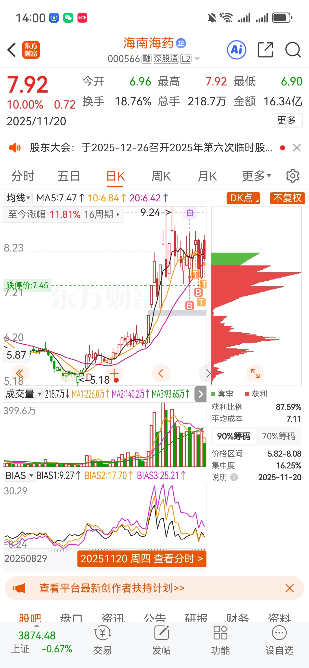 $海南海药(SZ000566)$ 减仓,将成本降到6.9