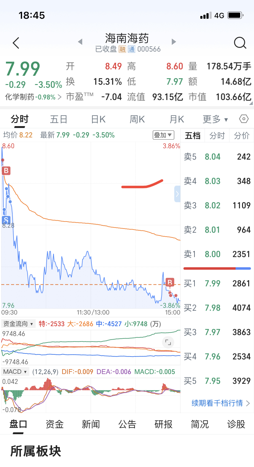 $海南海药(SZ000566)$ 总得8.05的本,这个买卖点完美!明天大肉跑不掉!今天主力净流入太多了!看好明天大阳!