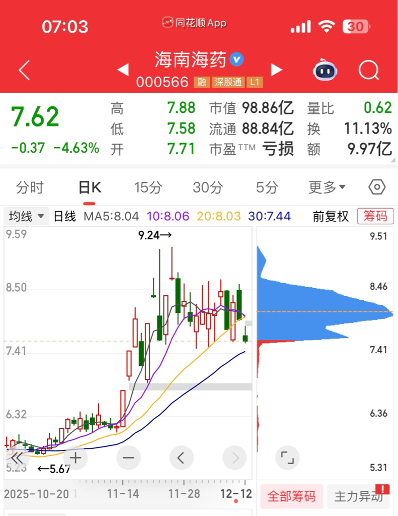 $海南海药(SZ000566)$ 真的是套的死死的,你是主力你拉不拉???下方筹码早就跑光了,剩下小散在山顶吹风