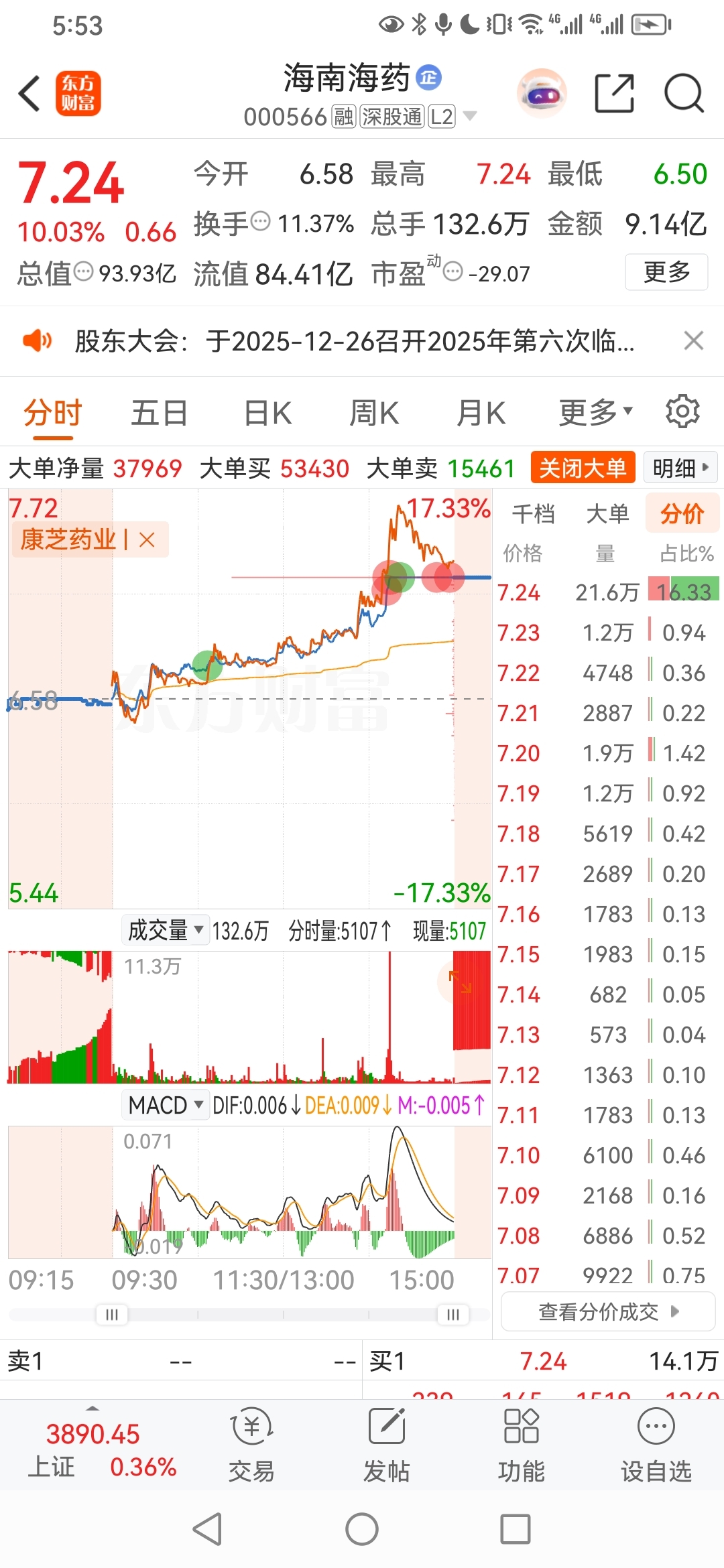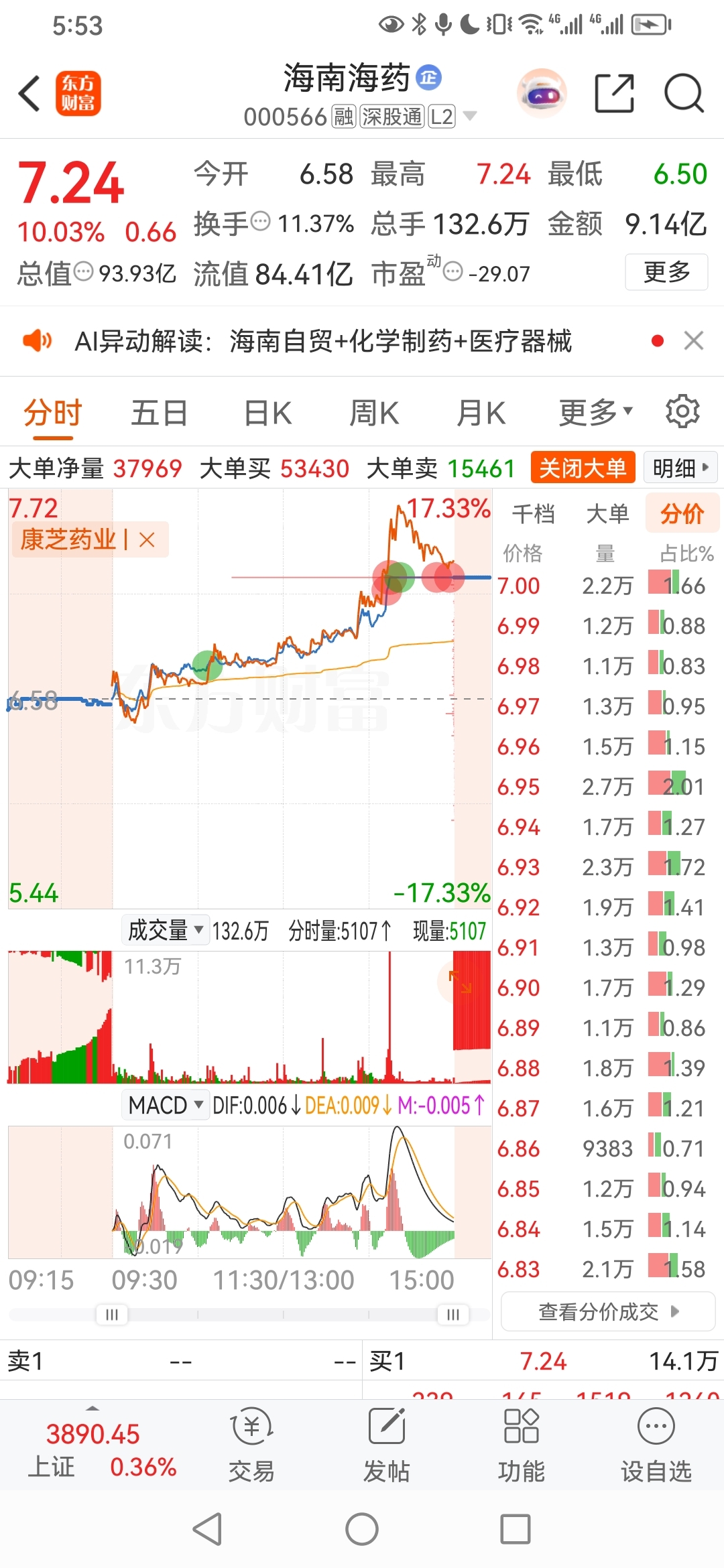 @妙想@炒股冠军军哥@财气盈盈秋水记住,军哥思路股票,海南海药。价格,成交。