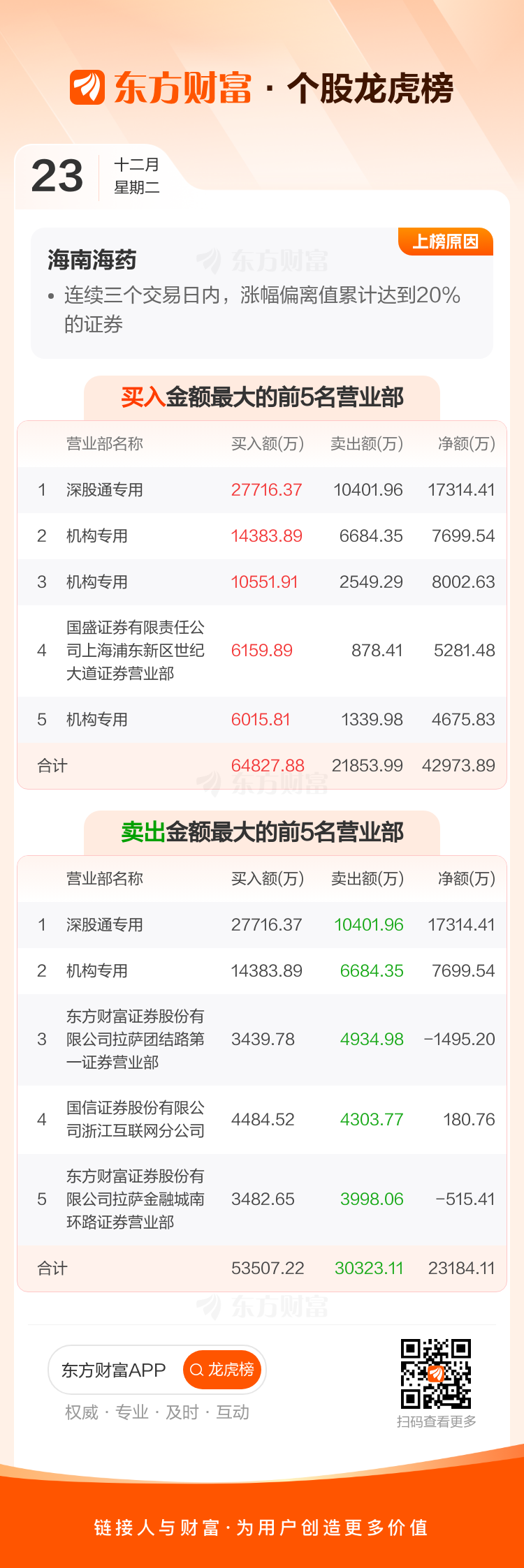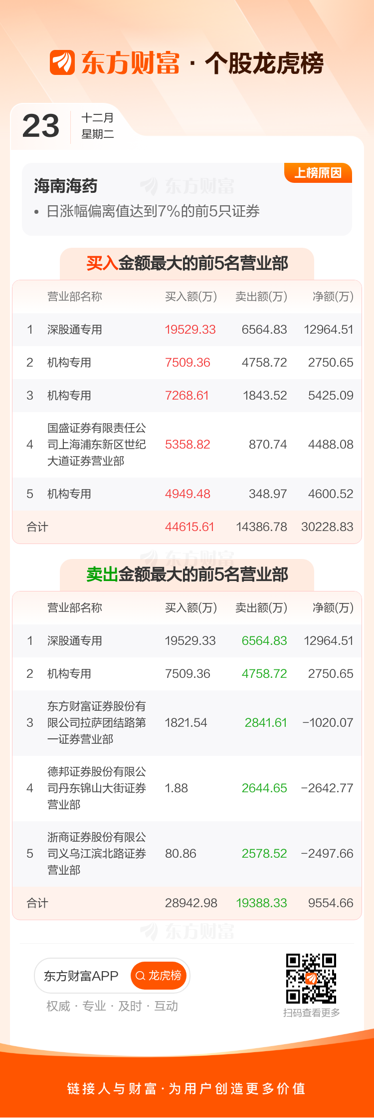 交易所2025年12月23日公布的交易公开信息显示,海南海药因成为日涨幅偏离值达到7%的前5只证券、连续三个交易日内,涨幅偏离值累计达到20%的证券上榜。海南海药当日收报8.76元,涨跌幅10.05%,偏离值10.02%,换手率29.43%,成交额29.66亿。异常期间12月19日至12月23日,期间涨幅33.13%,累计偏离值31.03%,区间成交额52.09亿。