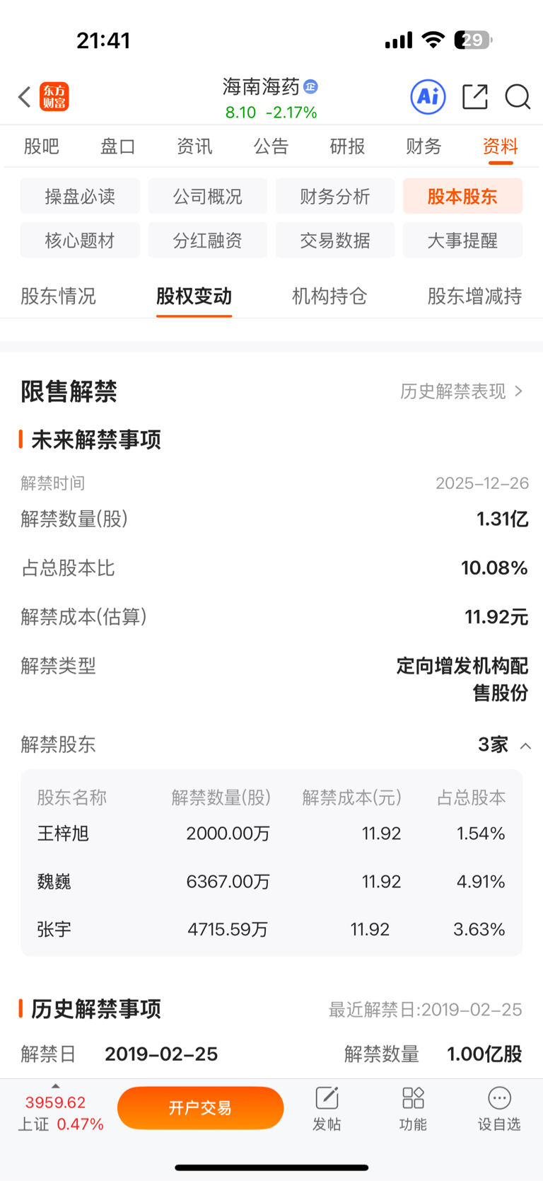 $海南海药(SZ000566)$ 自己看吧解禁成本11.92