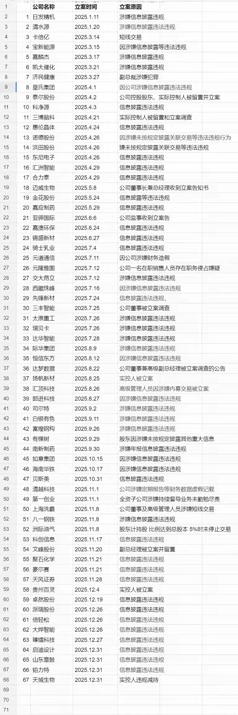 2025年,A股被立案调查的公司高达67家,清单如下图,大家注意避雷。
