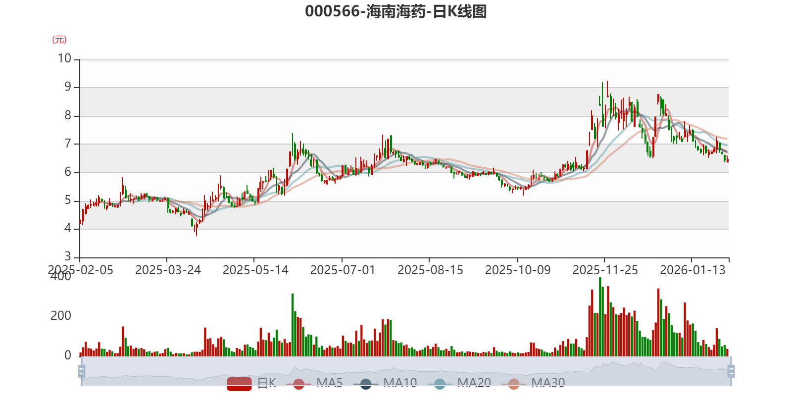 中证智能财讯海南海药(000566)1月30日晚间披露2025年度业绩预告,预计2025年实现营业收入8亿元至9亿元;归母净利润亏损3.5亿元至4.3亿元,上年同期亏损15.25亿元;扣非净利润亏损3.8亿元至4.8亿元,上年同期亏损11.95亿元;基本每股收益-0.2698元/股至-0.3314元/股。以最新收盘价计算,市净率(LF)约30.11倍,市销率(TTM)约9.86倍。